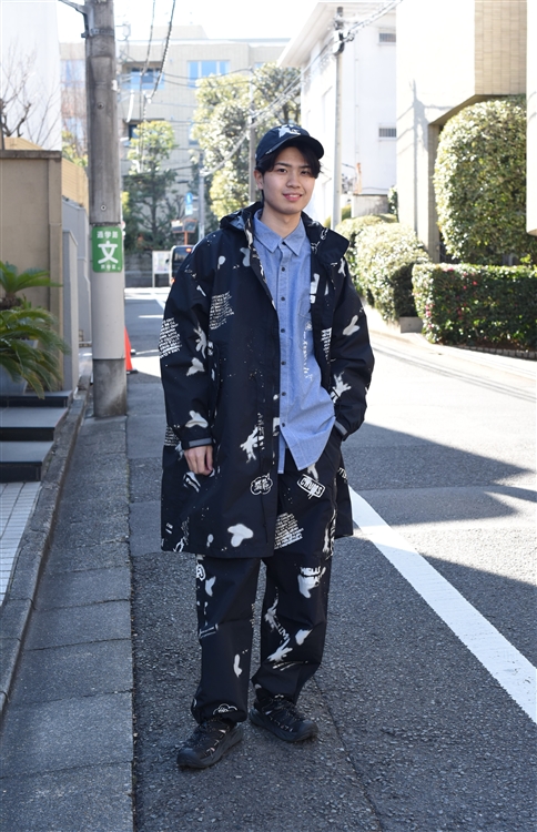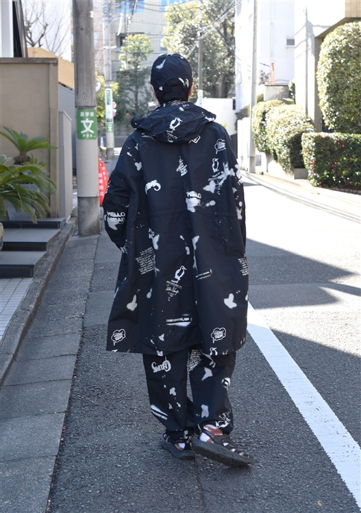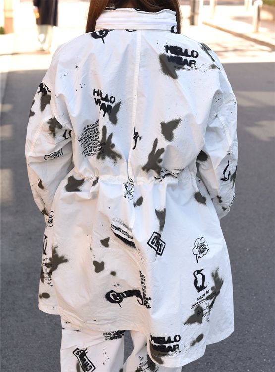 ステンシル×スプレーの大胆な総柄デザインが目を惹く一着です。