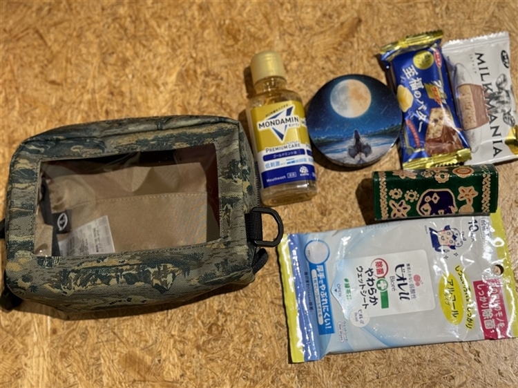 普段使う除菌シートやこっそりお菓子も入れて🤭