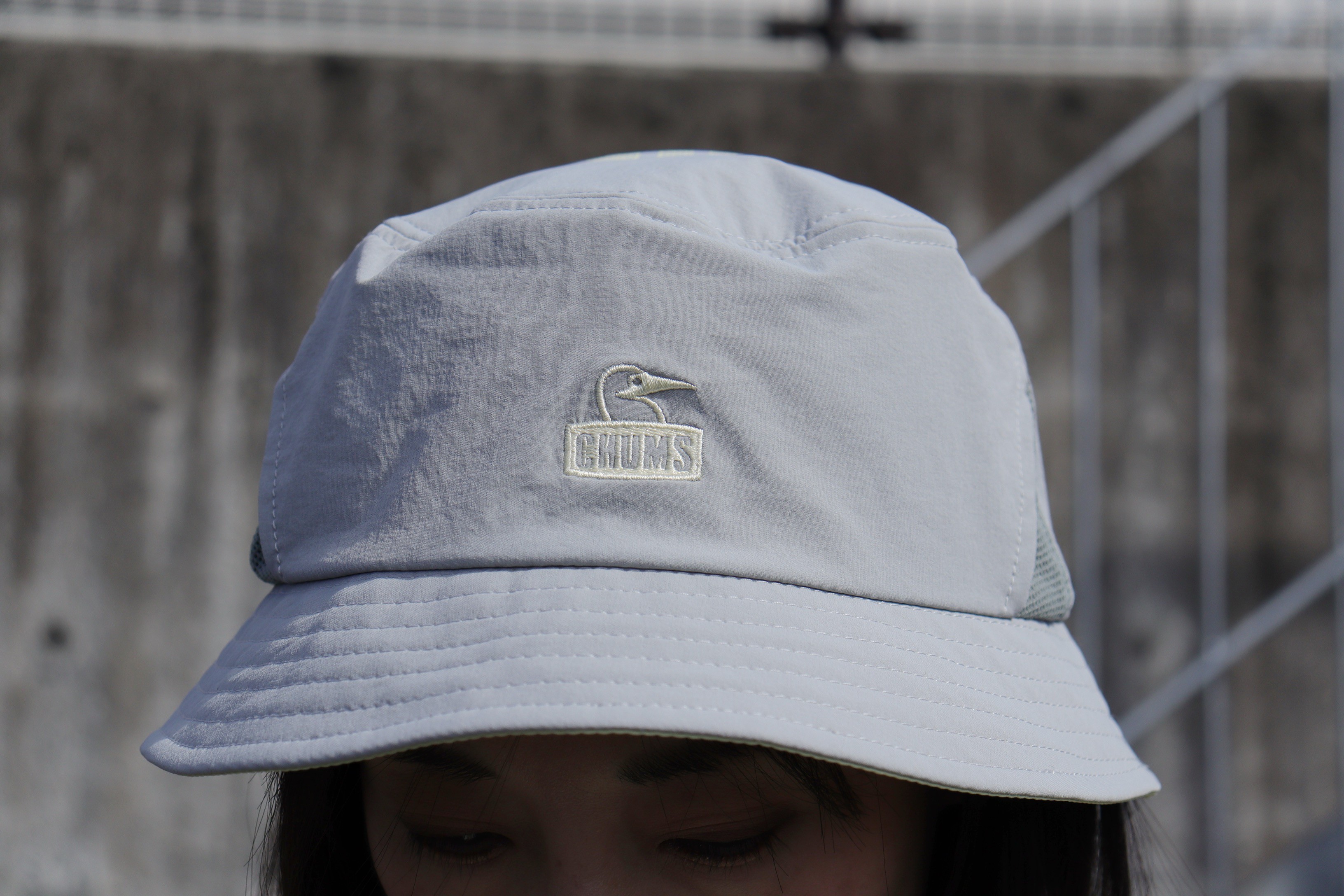 フロントにはブービーフェイスロゴの刺繍を、頭上にはCHUMSロゴプリントを大胆にレイアウト。