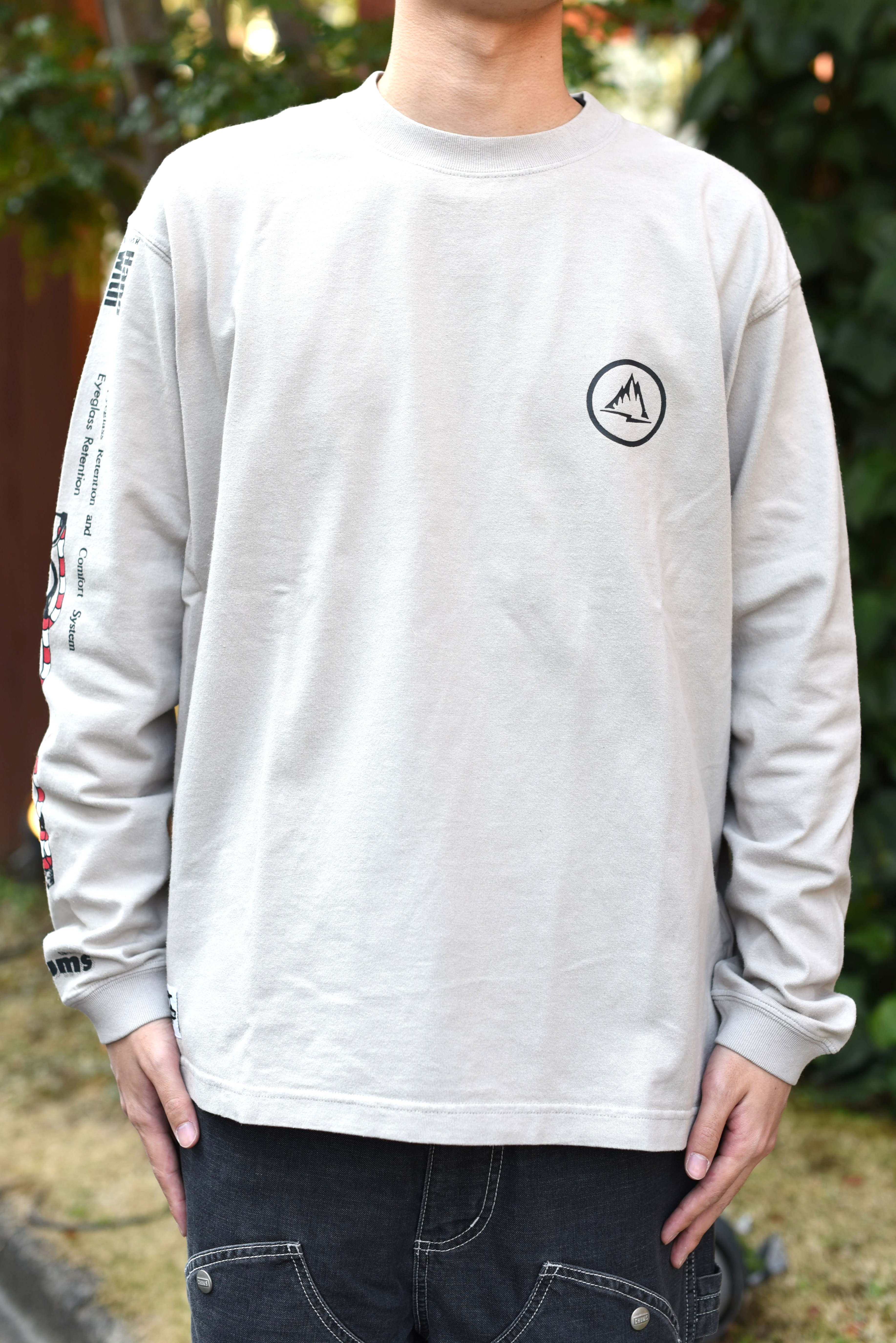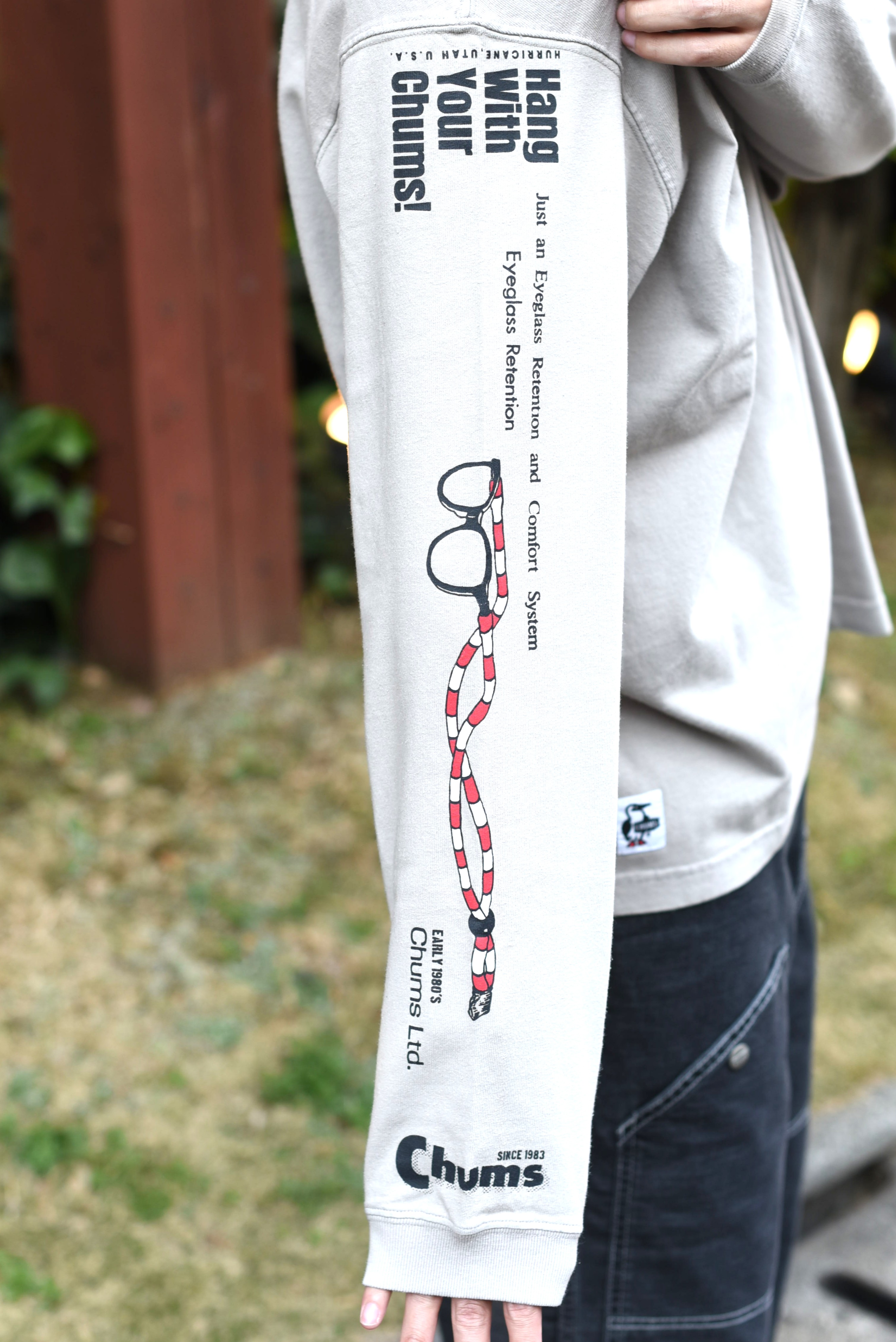片袖にはリテーナーのモチーフやキャッチフレーズなどのCHUMSの原点を感じさせるグラフィックを配置!