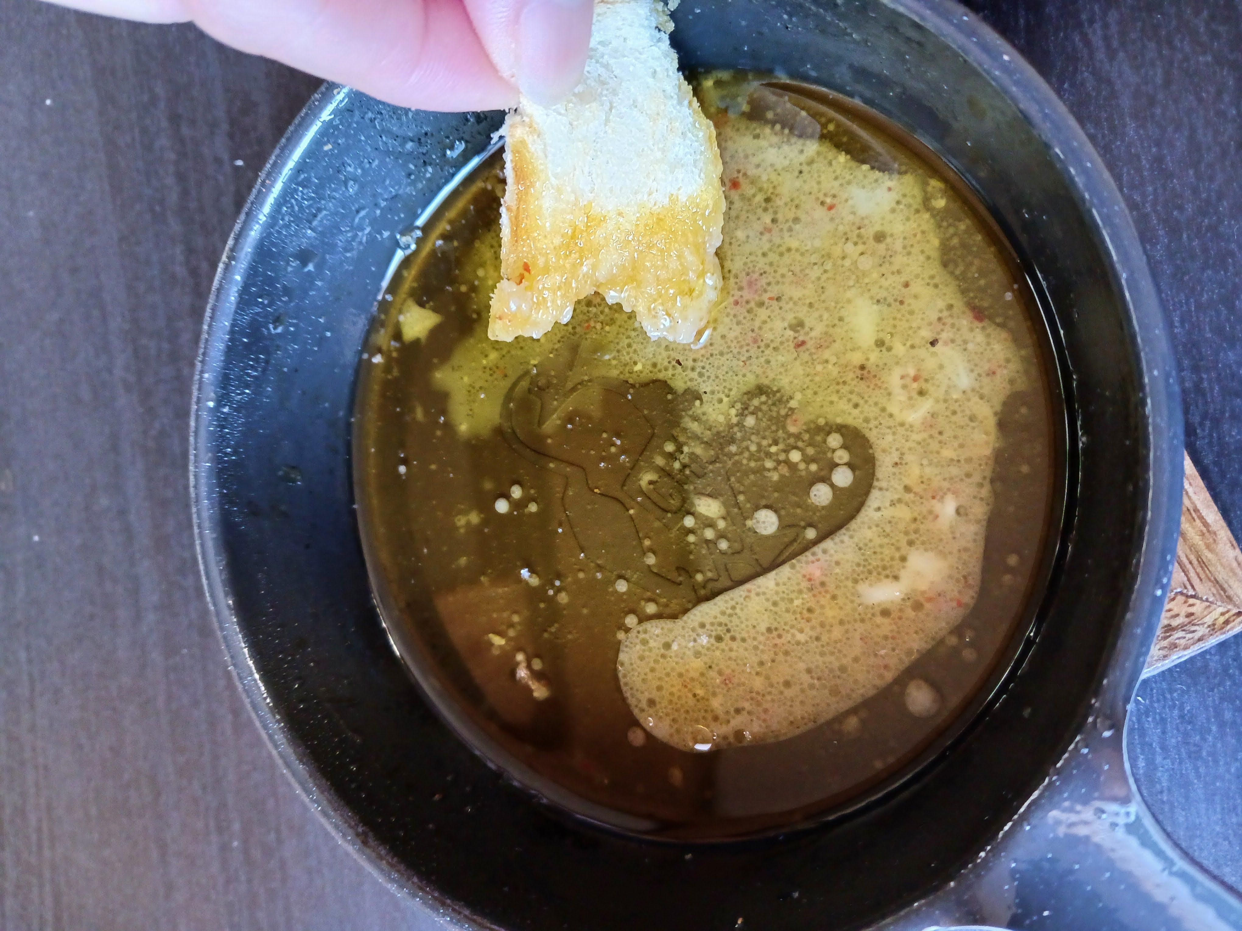 具材のうまみが染み出たオリーブオイルにトーストをつけて・・・