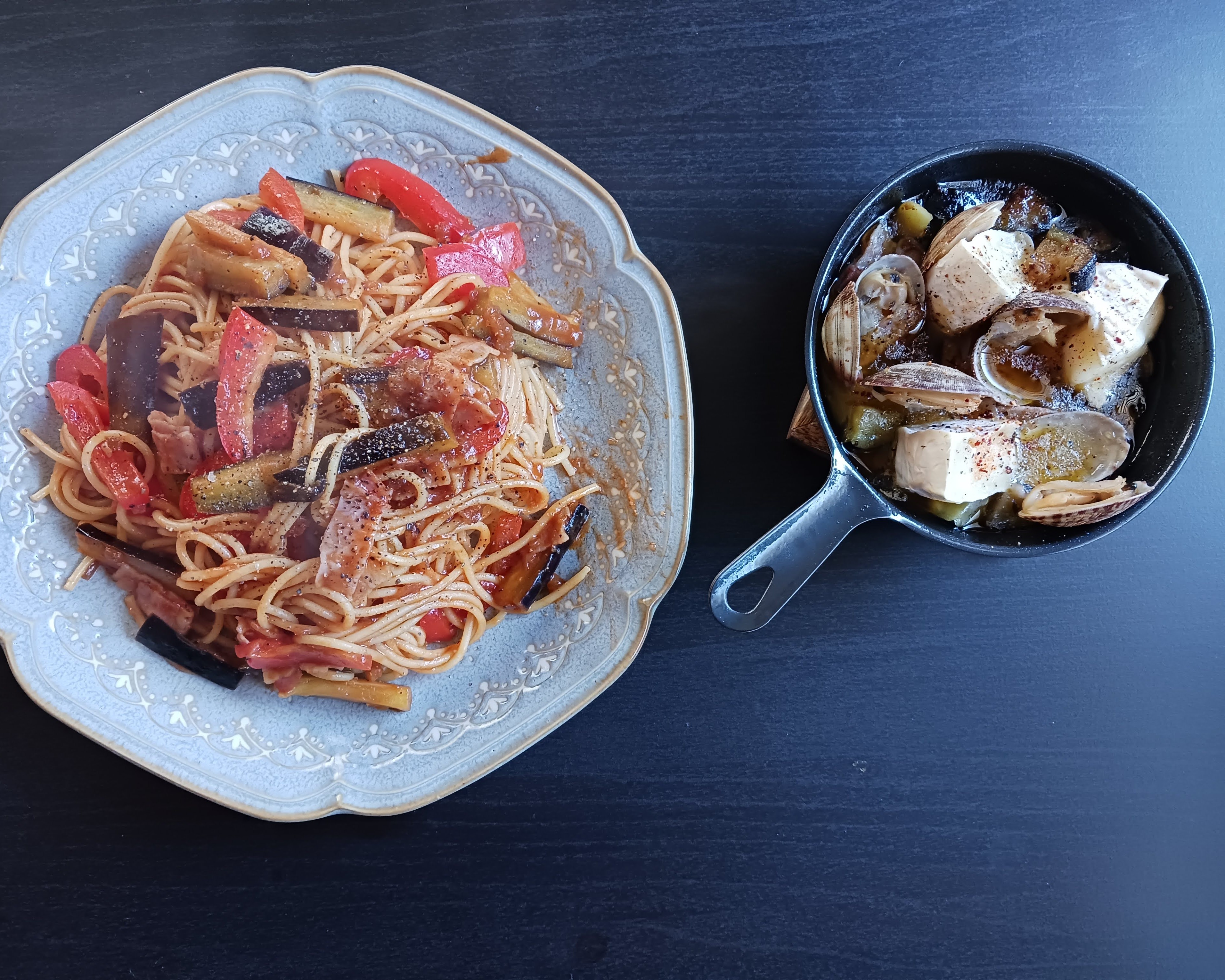 アヒージョはナスとベーコンとアサリとカマンベールチーズ🍆🐖🧀