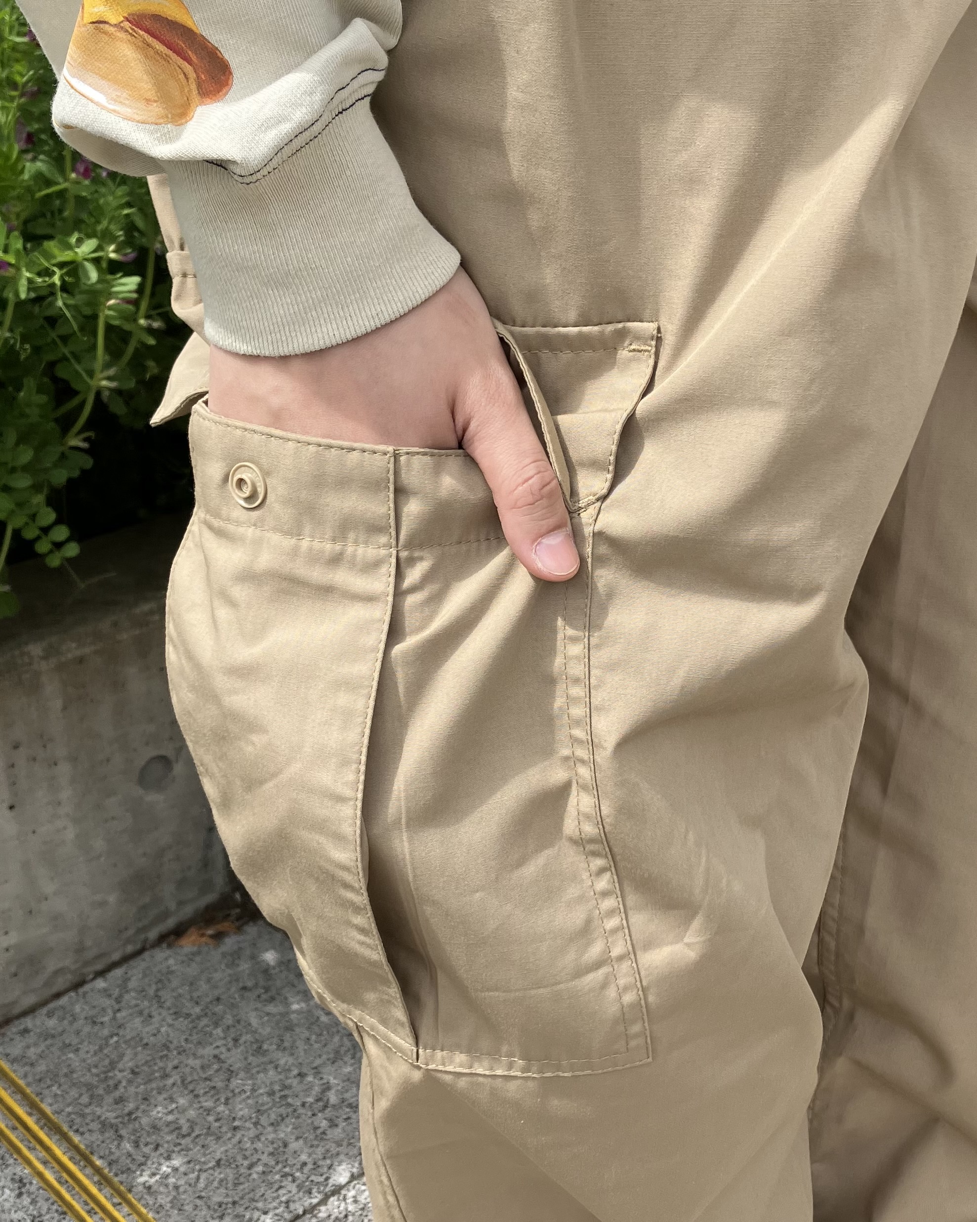 両サイドにはポケット2つとカーゴ特有のフラップ付きの大きいめポケット、おしりにも付いていて