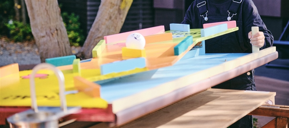 台を左右に傾けながら、設置されたゴールにボールを入れよう!!
