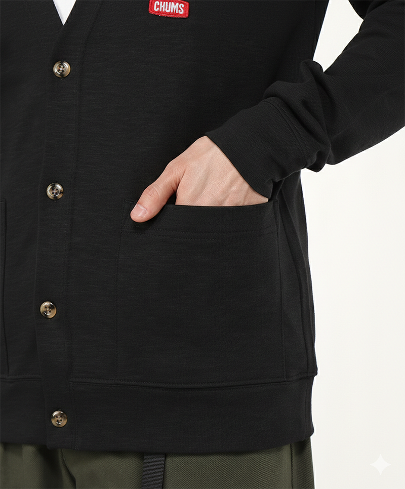 気軽に羽織れて、きちんと感も演出できるカーディガン。フロントには使い勝手の良いポケットを配置し、左胸にはCHUMSロゴのミニワッペンをさりげないアクセントとしてプラス。季節の変わり目にも使いやすく、軽い羽織りとして一枚持っておくと重宝するユーティリティアイテムです。