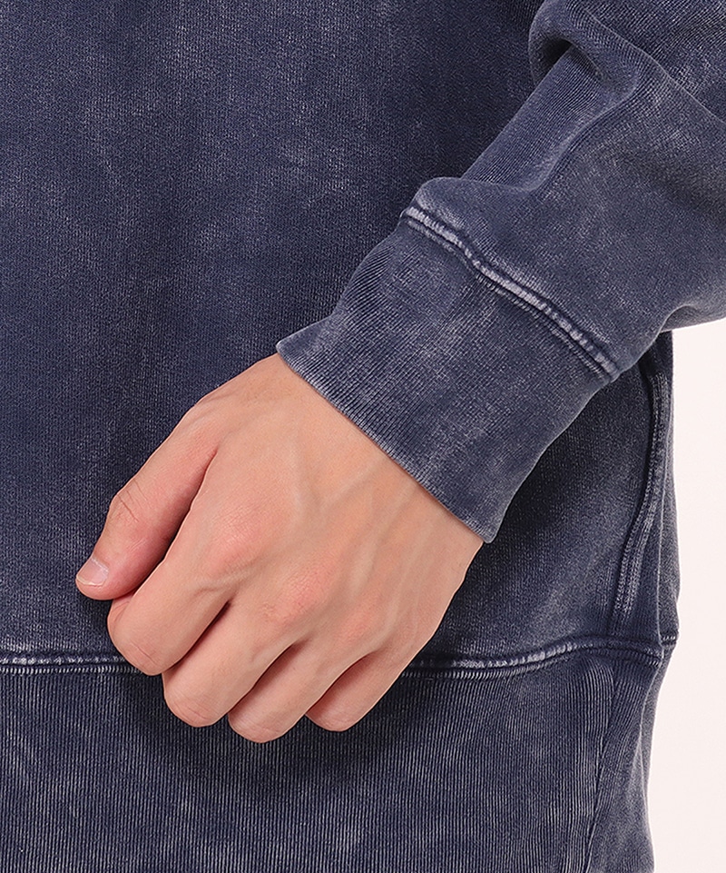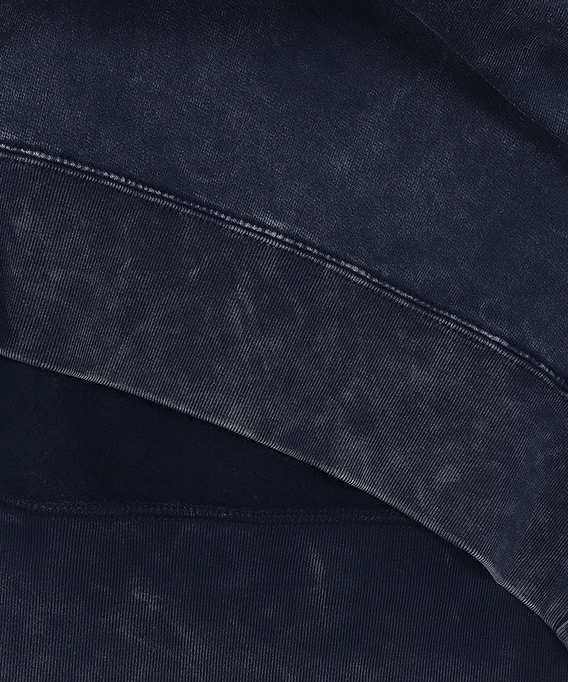 ピグメント加工を施したUSAコットン100%仕立てのスウェットを使用。製品の状態で特殊な顔料で染めて洗いをかけることで、古着のようなフェード感のある風合いを表現。着こんでいくことで自然な色落ちを繰り返し、経年変化を楽しむことができます。