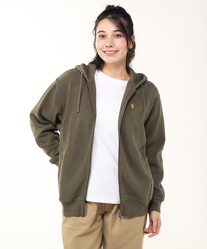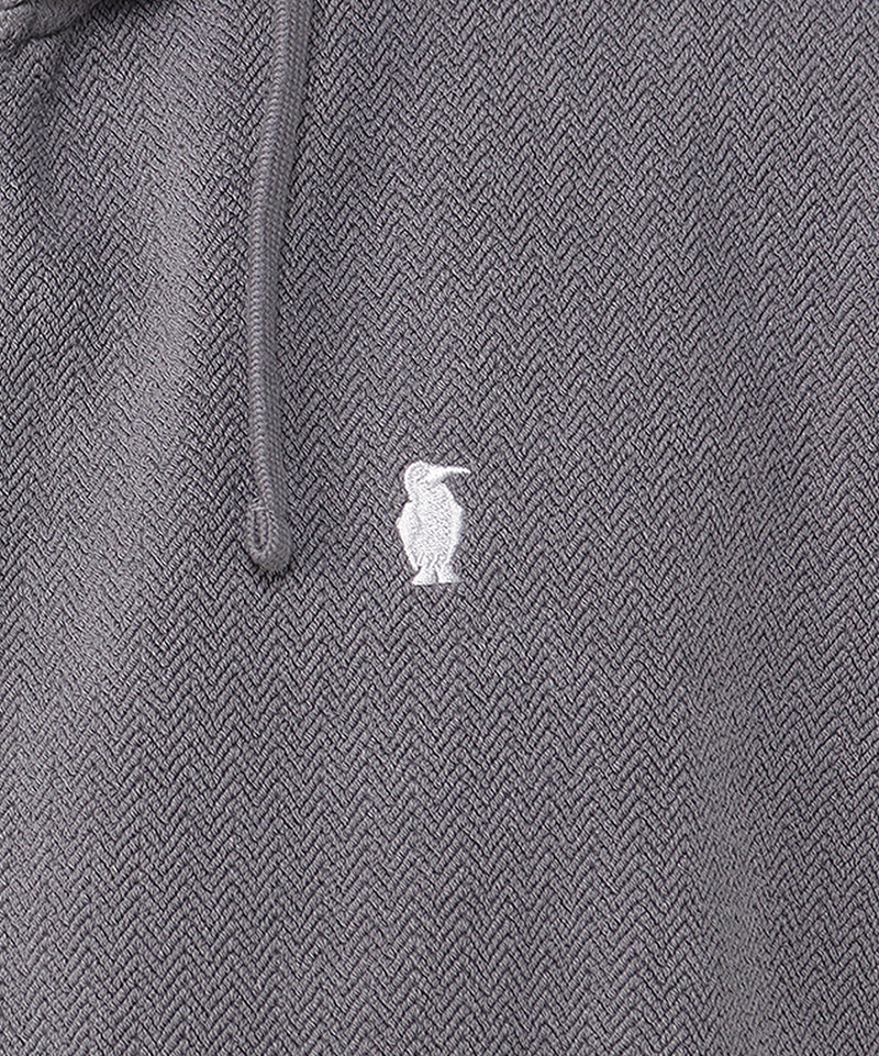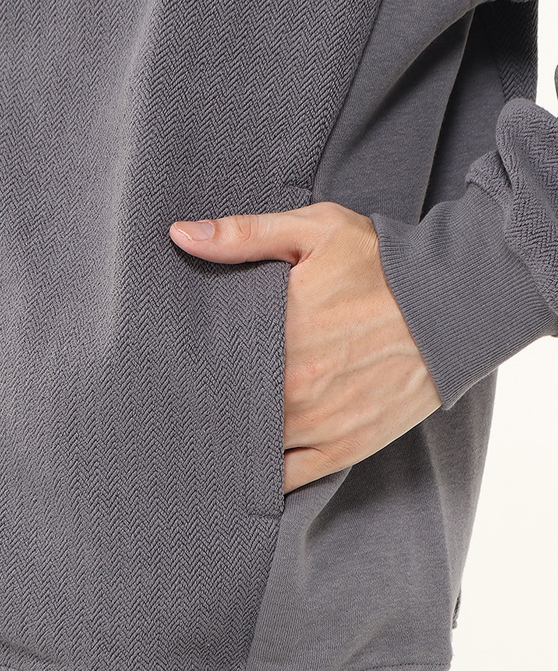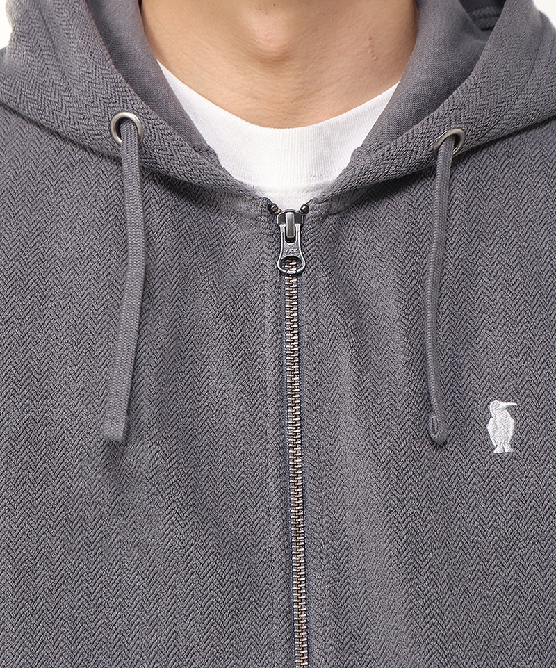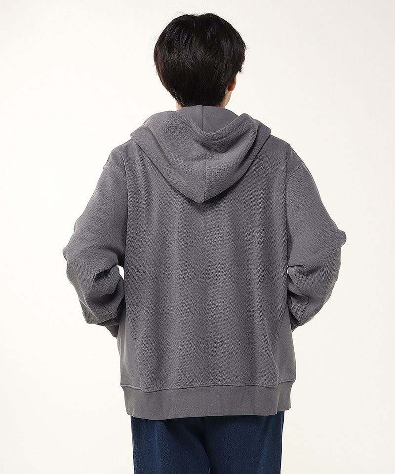 ヘリンボーン柄を取り入れたスウェットジップフーディ―。ゆったりとしたオーバーサイズシルエットで、リラックス感のある着心地が魅力。脇のパネルに無地の生地を使うことで、デザインにメリハリをプラスしました。