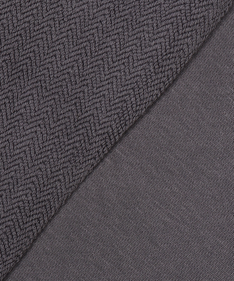 裏毛生地のパイル面にヘリンボーン柄を施したスウェットシリーズ。通常は肌面にくるパイル面をあえて表側に使用することで、あそびゴコロのあるデザインに仕上げました。柄をくっきりと表現するために度詰めで編み立てられており、肉厚でしっかりとした生地感が特徴。柔らかな肌触りと程よい厚みで、シーズンを問わず快適に着用できます。
