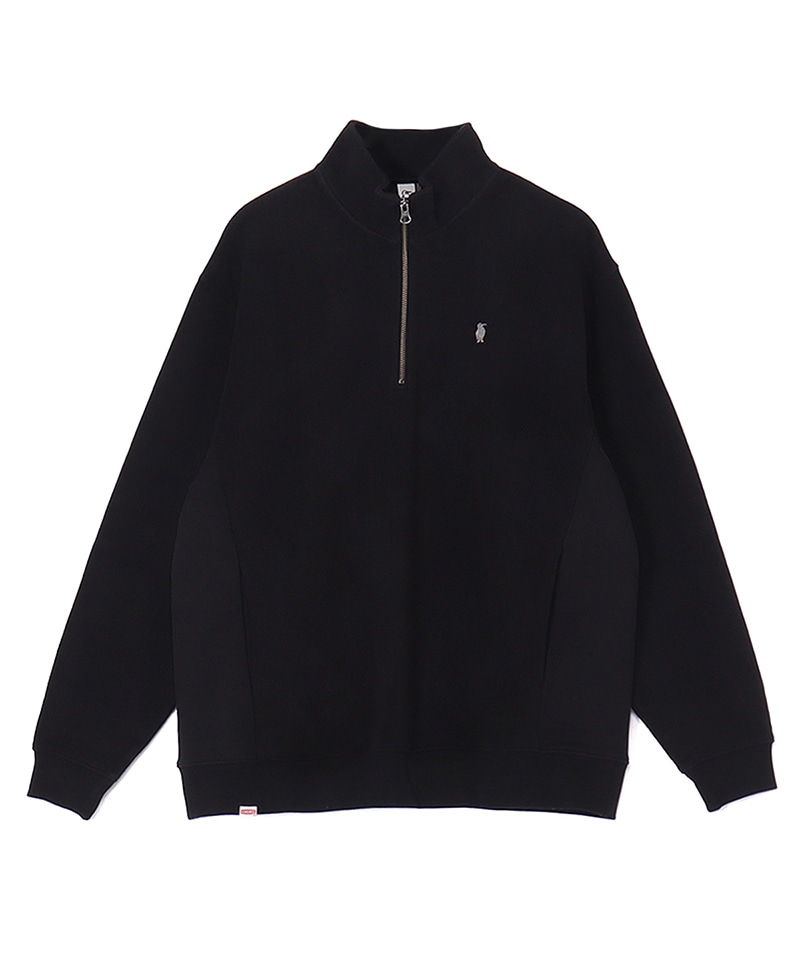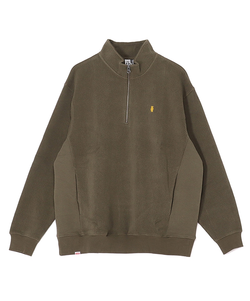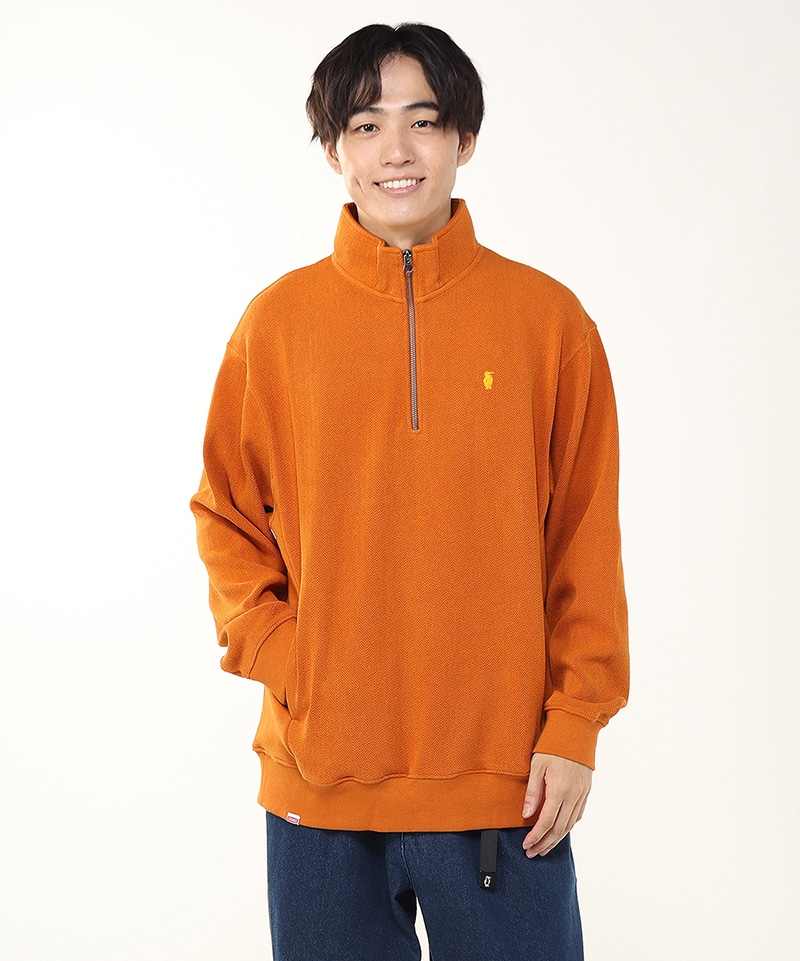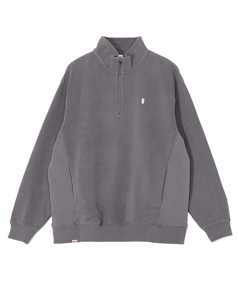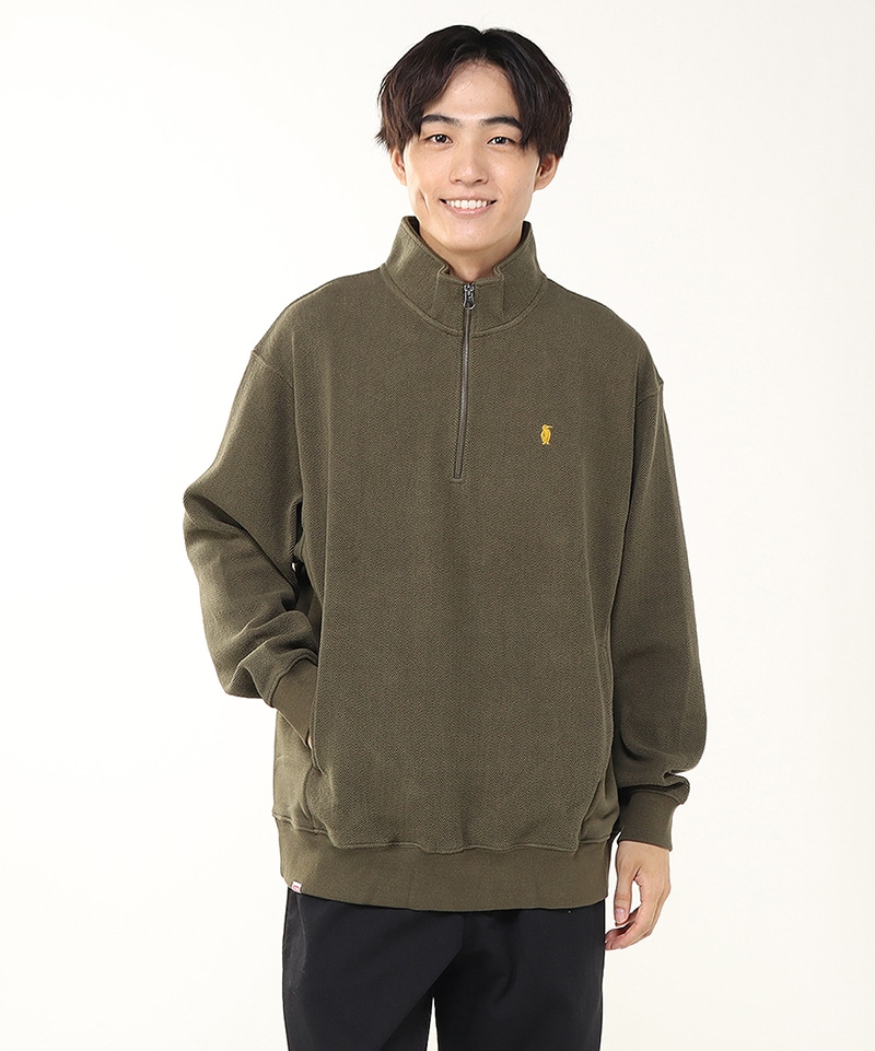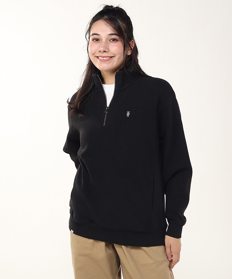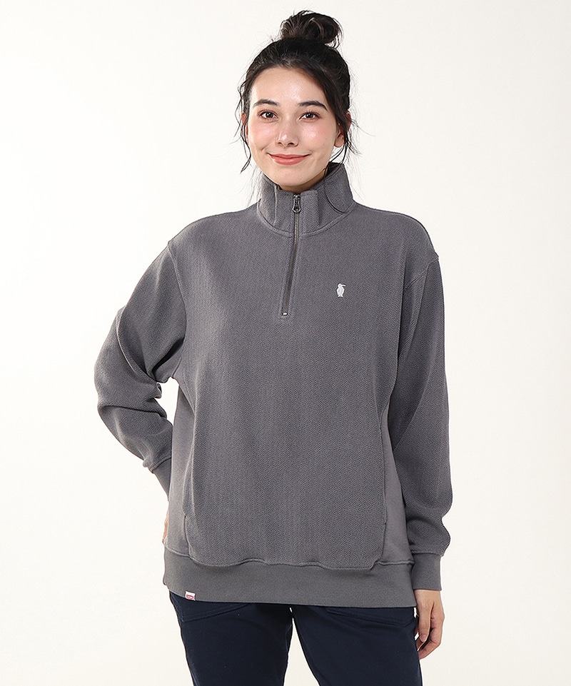 両サイドにはポケットを配置。左胸にはブービーシルエット刺繍をあしらい、シンプルながらもさりげないアクセントに。ハーフジップで首元の印象を自在に変えられ、1枚でも、重ね着も楽しめる万能アイテムです。