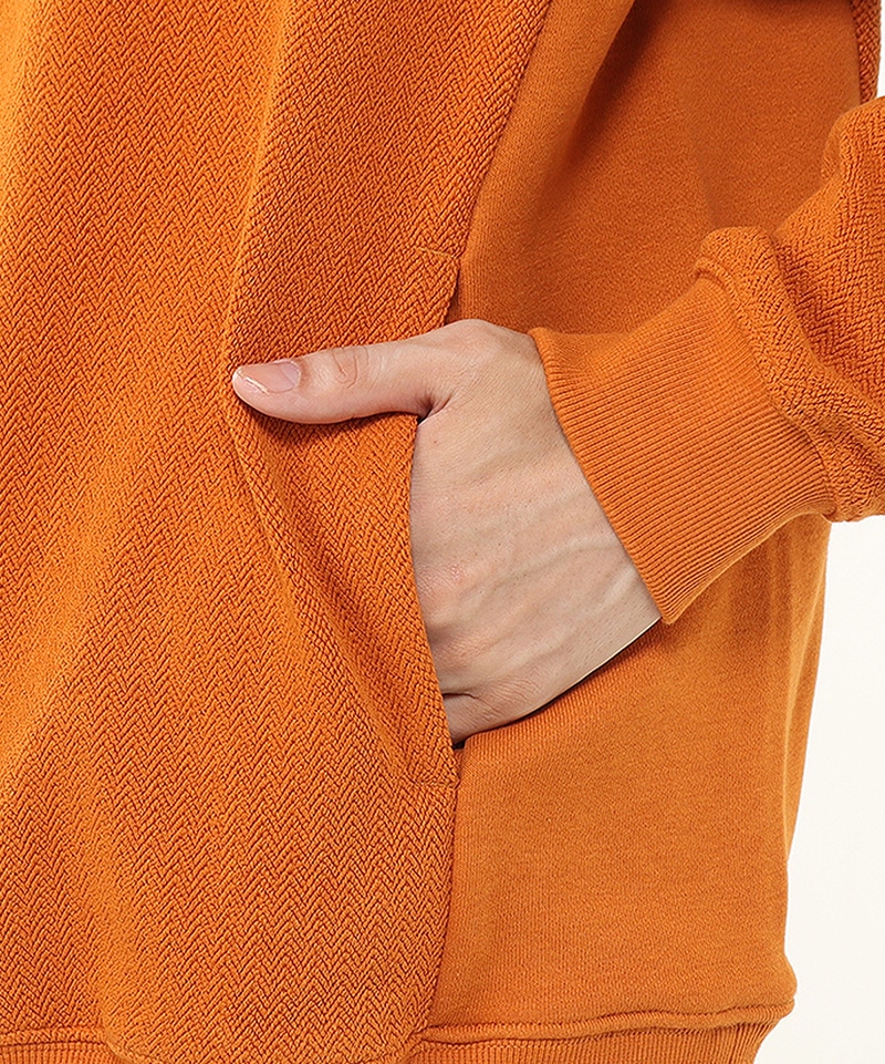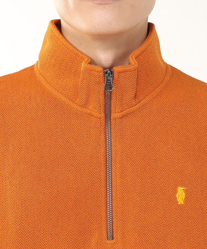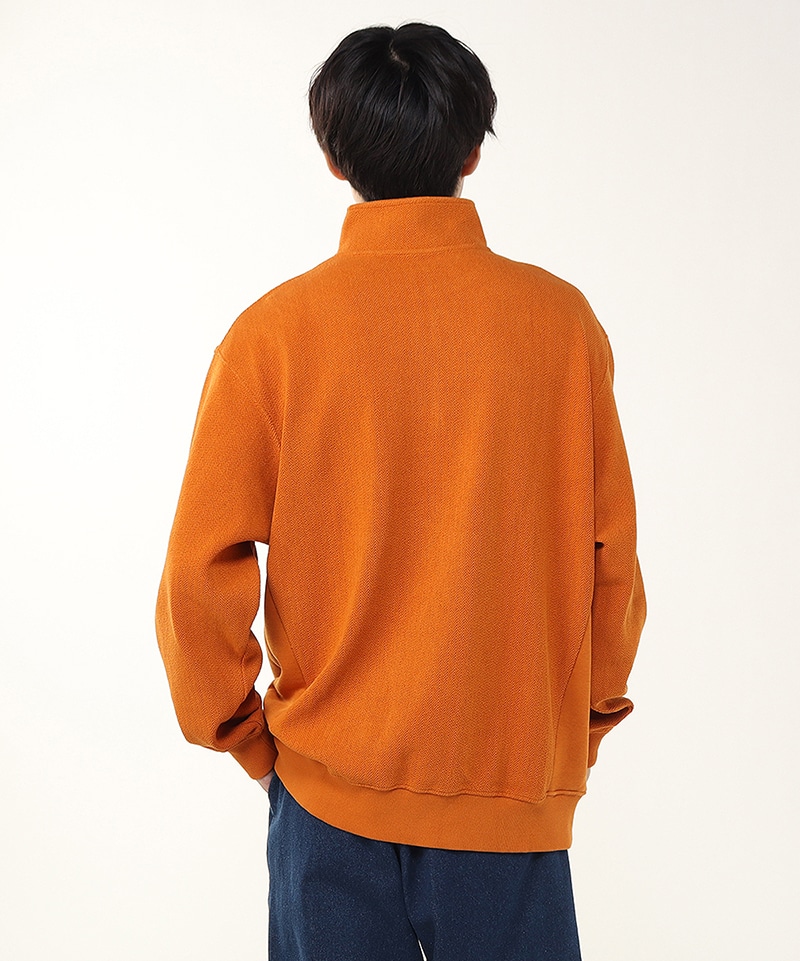 ヘリンボーン柄を取り入れたハーフジップスウェット。ゆったりとしたオーバーサイズシルエットで、リラックス感のある着心地が魅力。脇のパネルに無地の生地を使うことで、デザインにメリハリをプラスしました。