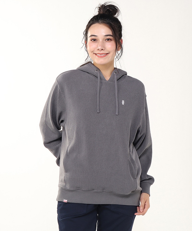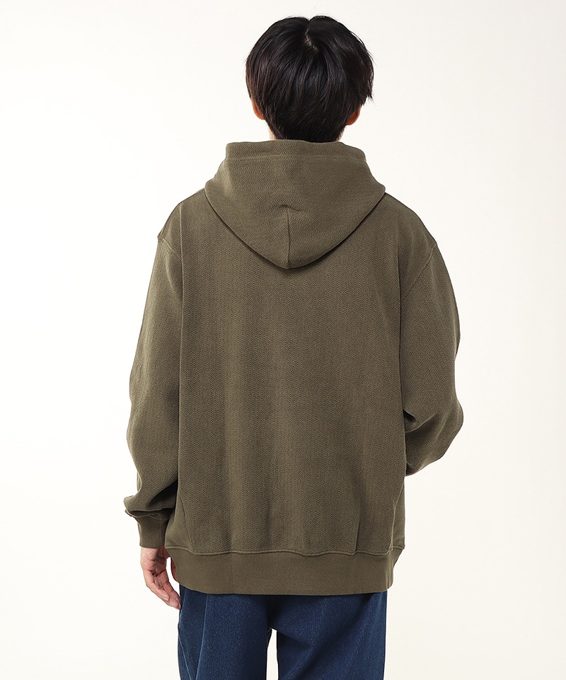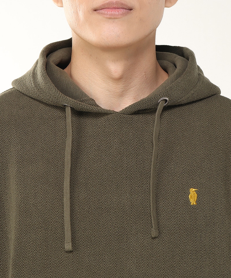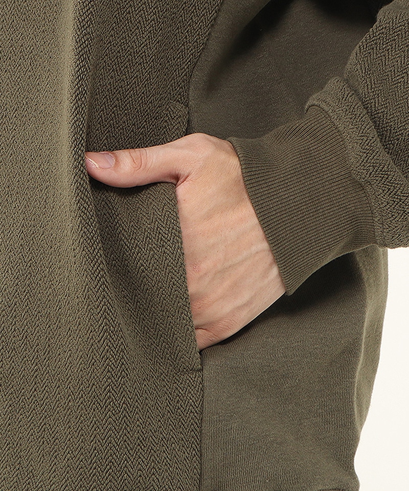 ヘリンボーン柄を取り入れたスウェットプルオーバーパーカー。ゆったりとしたオーバーサイズシルエットで、リラックス感のある着心地が魅力。脇のパネルに無地生地を使うことで、デザインにメリハリをプラスしました。
