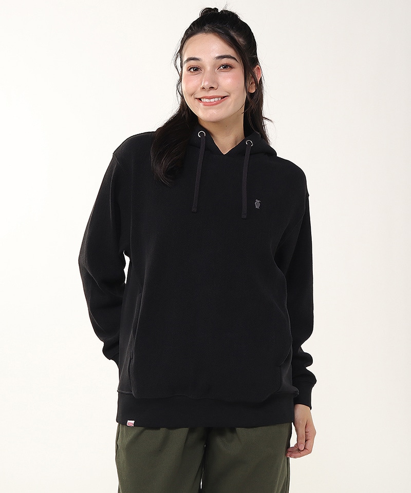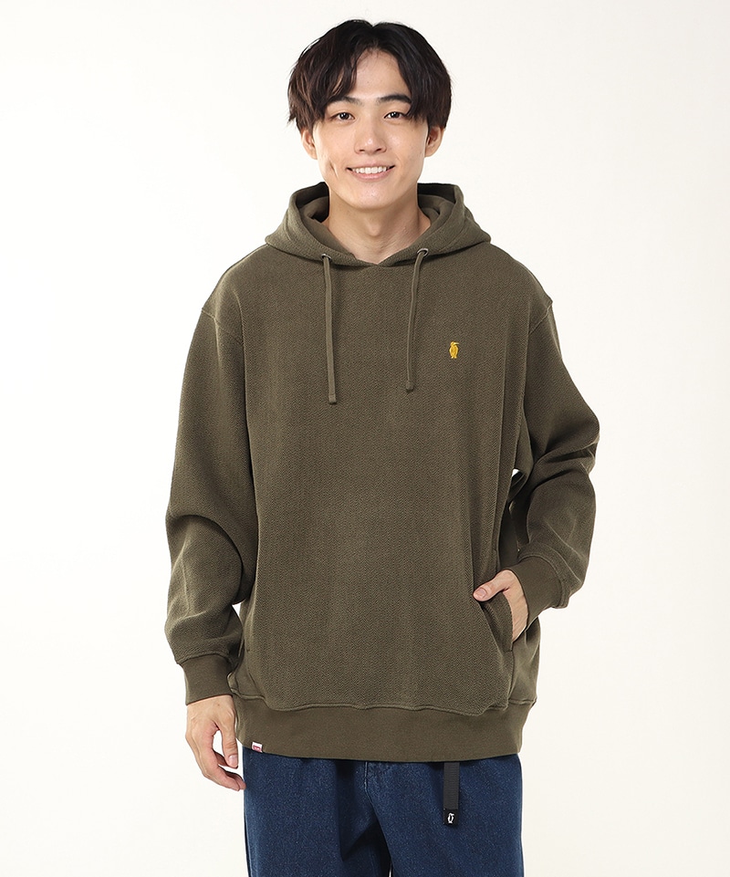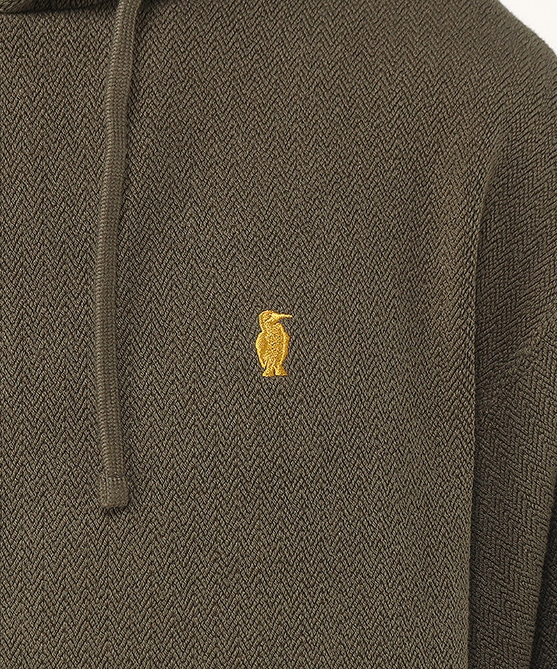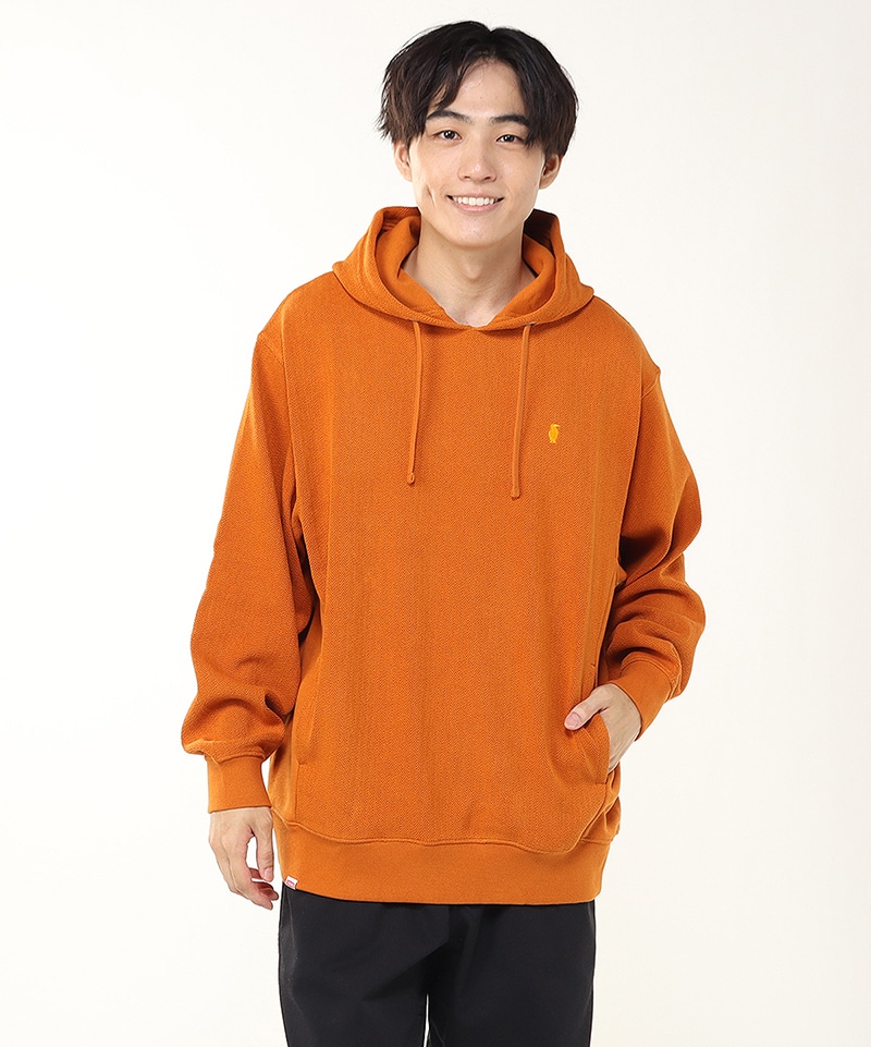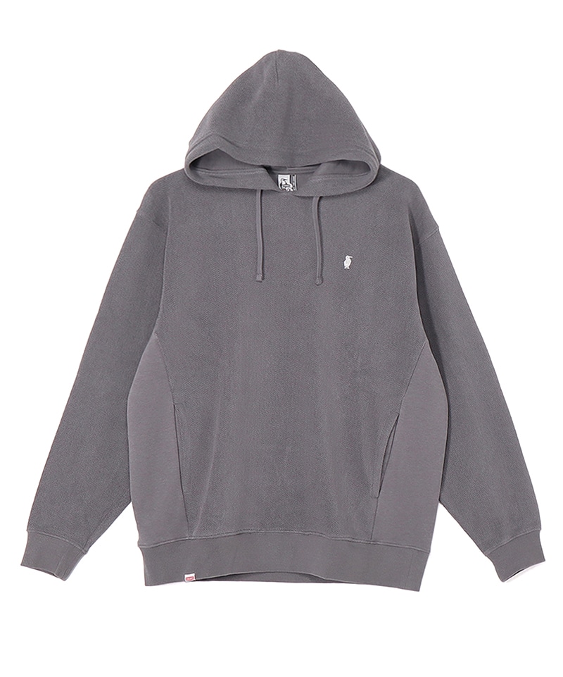 ヘリンボーン柄を取り入れたスウェットプルオーバーパーカー。ゆったりとしたオーバーサイズシルエットで、リラックス感のある着心地が魅力。脇のパネルに無地生地を使うことで、デザインにメリハリをプラスしました。