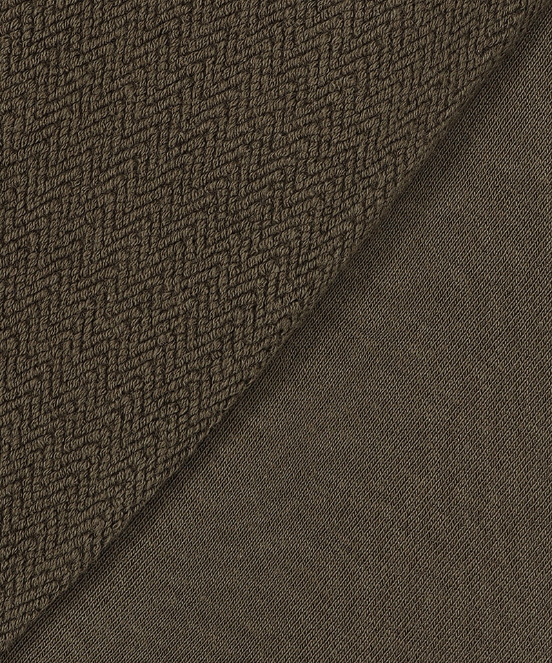 裏毛生地のパイル面にヘリンボーン柄を施したスウェットシリーズ。通常は肌面にくるパイル面をあえて表側に使用することで、あそびゴコロのあるデザインに仕上げました。柄をくっきりと表現するために度詰めで編み立てられており、肉厚でしっかりとした生地感が特徴。柔らかな肌触りと程よい厚みで、シーズンを問わず快適に着用できます。