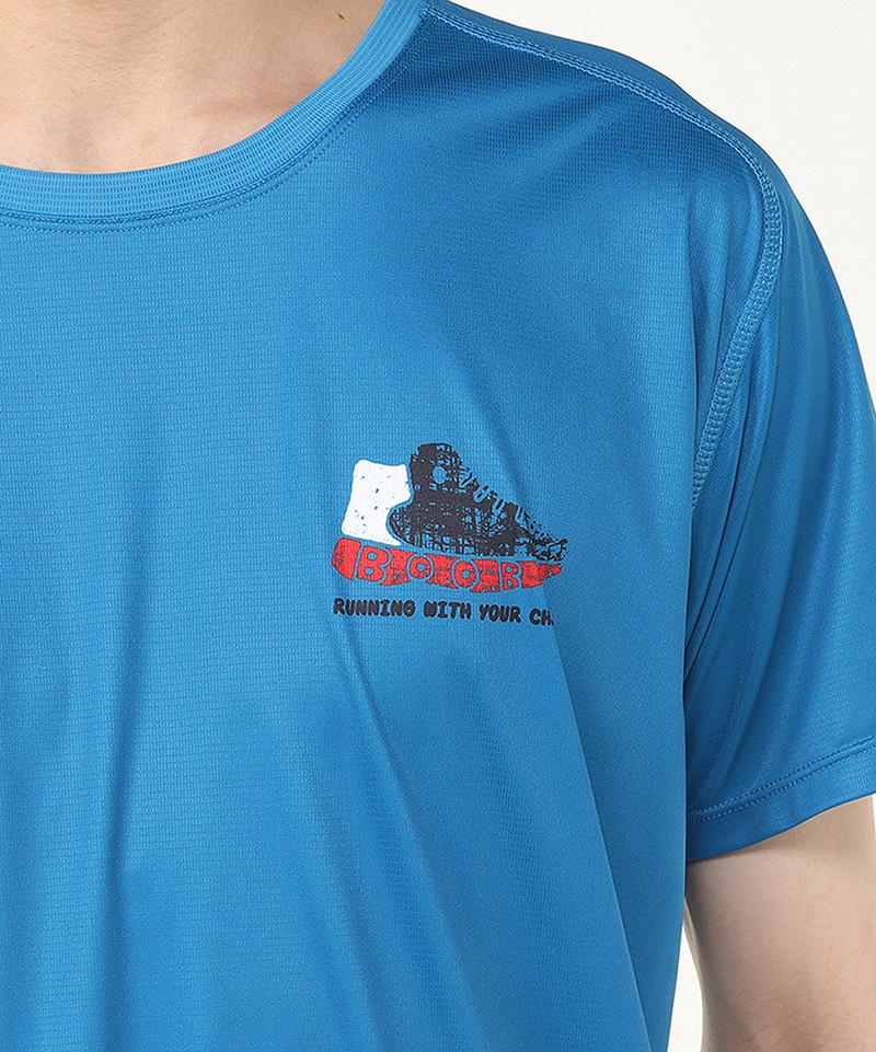 プリントにかすれ感を出すことで、シンプルながらもクールな雰囲気に仕上げたTシャツ。左胸にはブービーの顔をシューズ風にアレンジしたグラフィックを配置。背面には、モックシューズのソール部分をランニング仕様にアレンジした足跡プリントをあしらいました。ランニングシーンはもちろん、デイリーにも着やすいデザインです。