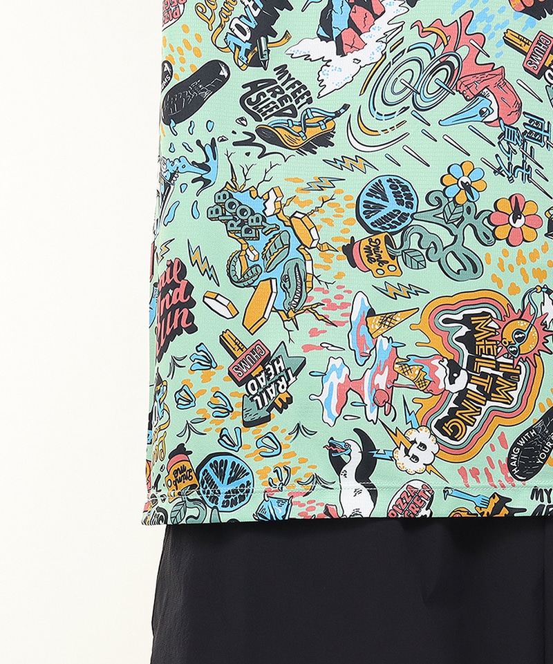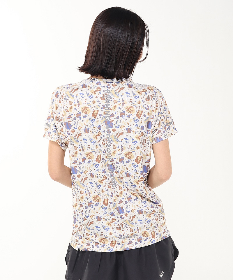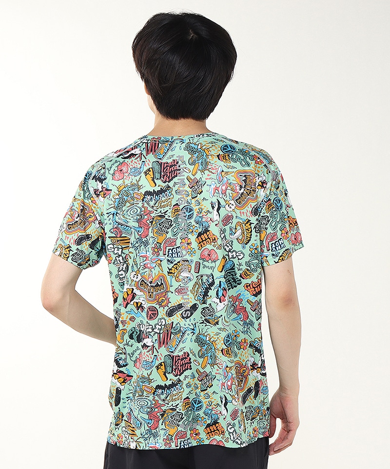 シーズングラフィックをプリントした、インパクトのある総柄Tシャツ。ラグランスリーブを採用することで肩の縫い目によるストレスを軽減し、スムーズな腕の動きをサポート。袖先にはブービーフット、背面には「RUNNING WITH YOUR CHUMS!」のリフレクタープリントを施し、夜間の視認性を高めながらデザインのアクセントにしました。