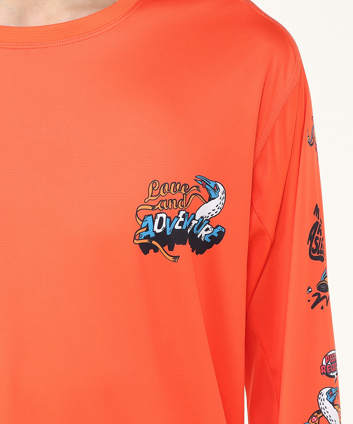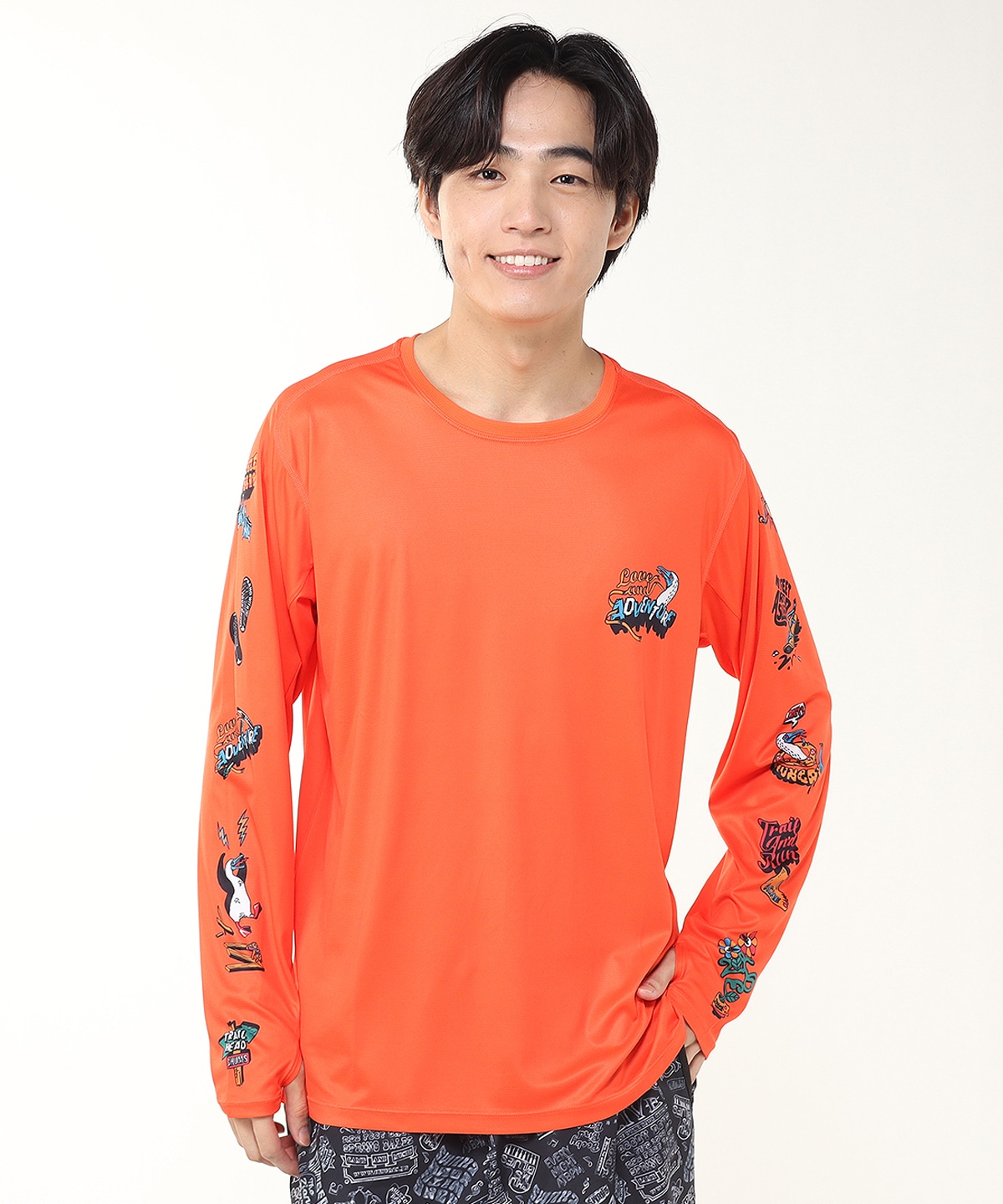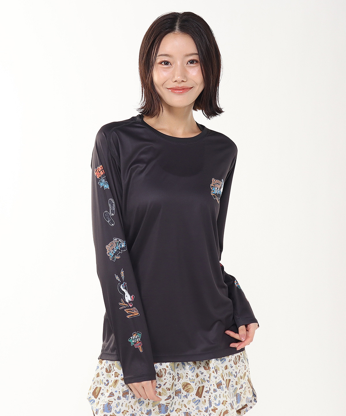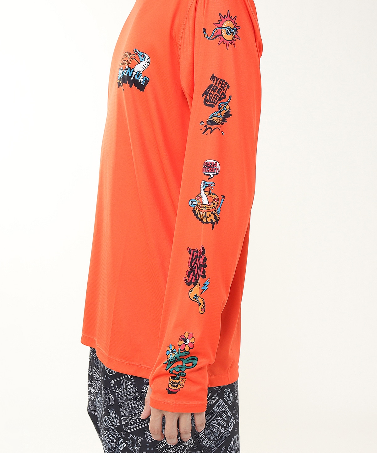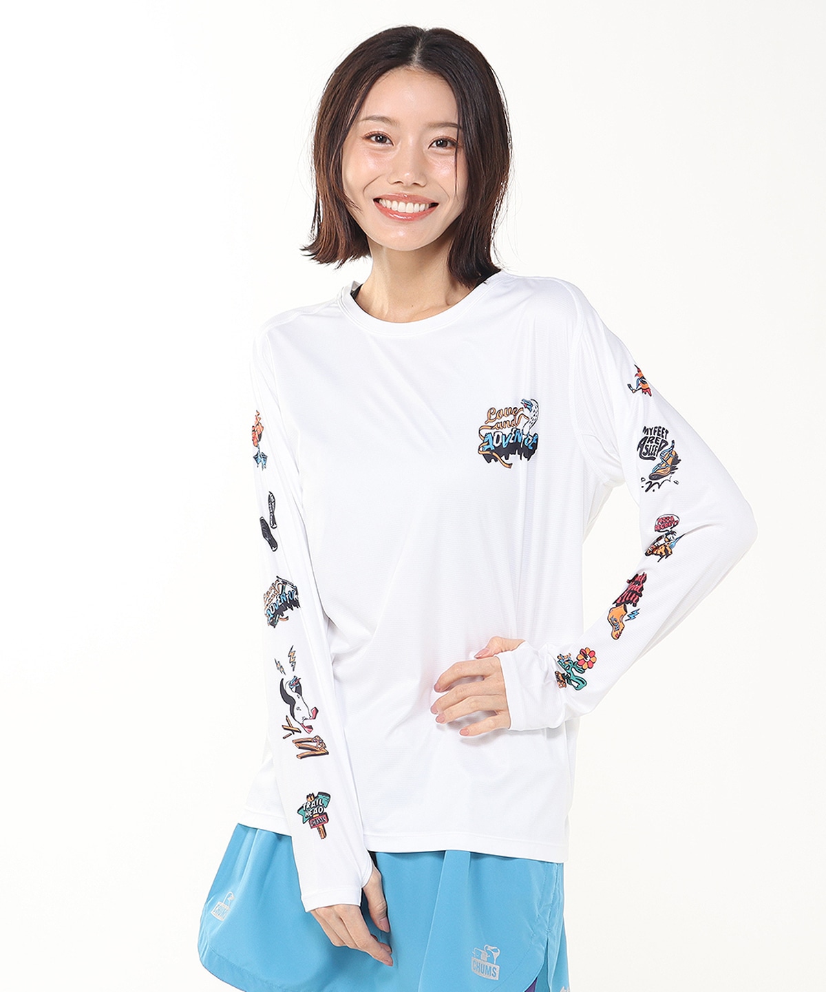 今季のグラフィック「Walks柄」をランニング仕様にアレンジしたロングスリーブTシャツ。左胸と袖には足の裏や身体で感じる原始的な感覚を表現したグラフィックをあしらい、背面には「Walks柄」を落とし込んだブービーバードロゴをプリント。さらに“Please Go Ahead.(お先にどうぞ)”のプリントを添え、ランナーへの気配りのメッセージを込めました。