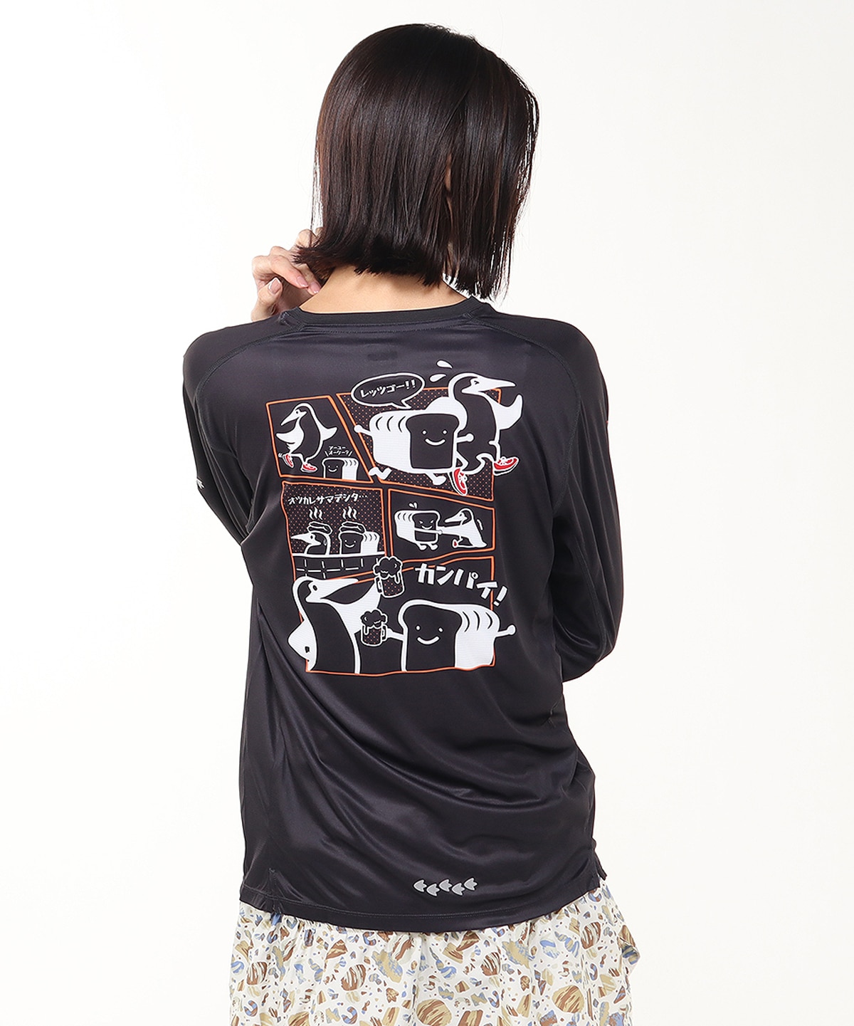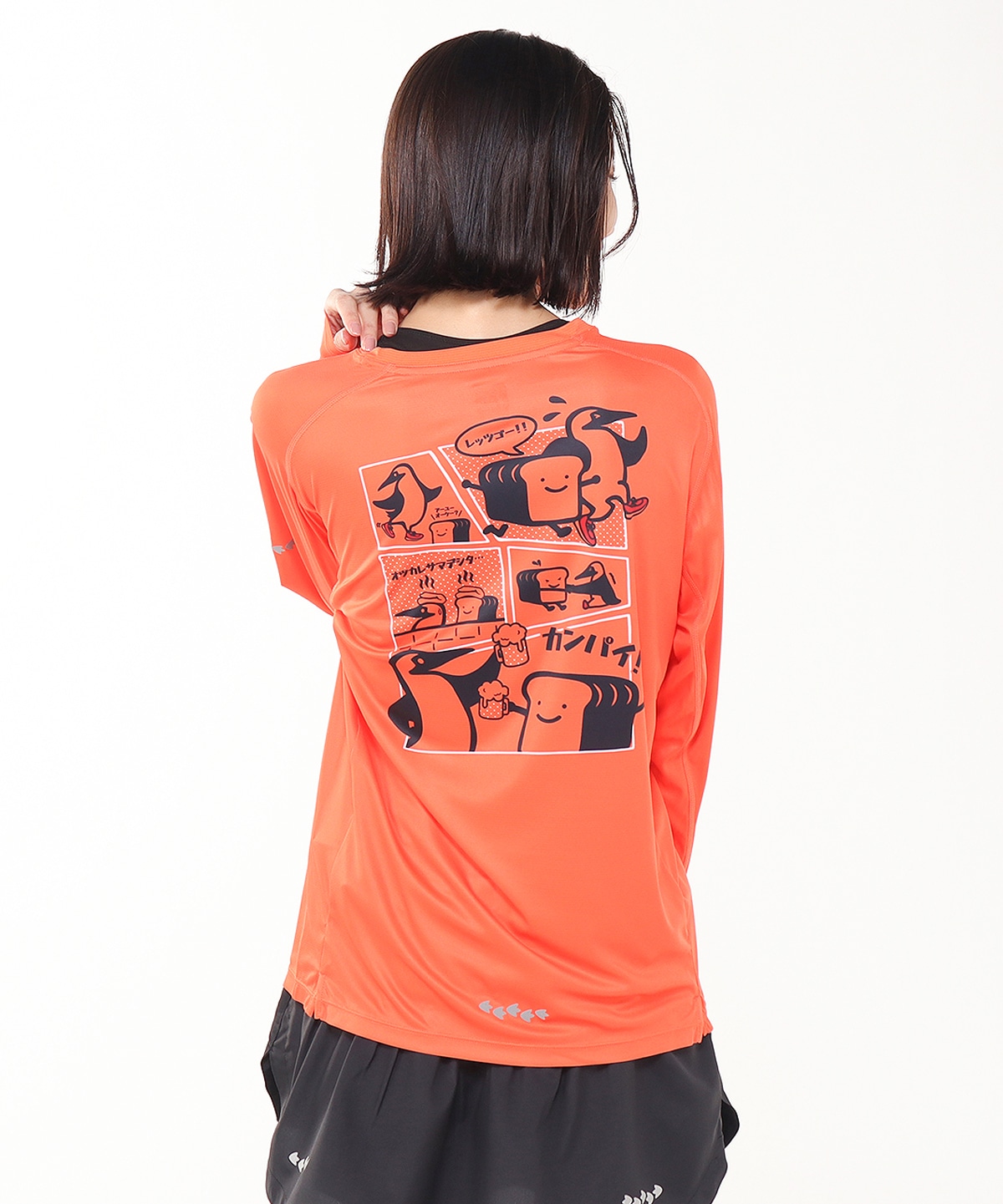 ウルトラランナーの“みゃこ氏”のアイコンとブービーバードを組み合わせたデザインを左胸に配置。バックプリントには、ブービーバードと同氏のアイコンがランニングから乾杯までを楽しむ様子を漫画風に描き、あそびゴコロあふれるグラフィックに仕上げています。袖と後ろ身頃にはリフレクタープリントをあしらい、夜間の視認性にも配慮しました。
