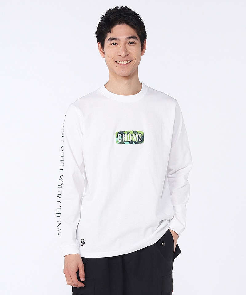 フロントにカモ柄の相良刺繍によるCHUMSロゴを配したロングスリーブTシャツ。森林を思わせる深みのあるカモフラージュ柄が、程よいアクセントになっています。