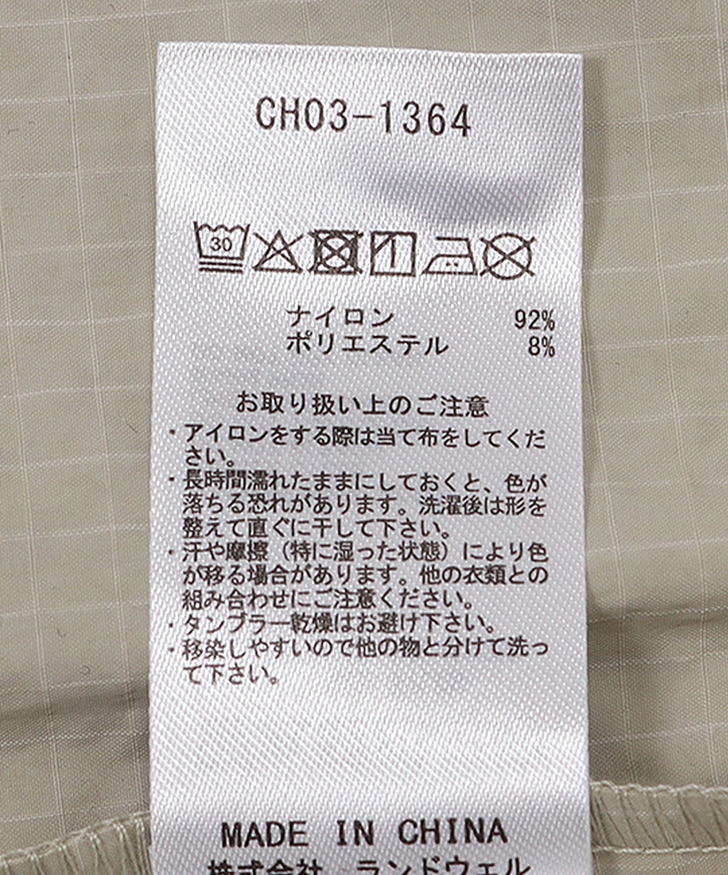 虫よけ加工を施したナイロンポリエステルのリップストップ生地を使用。虫よけ加工で用いた“ペルメトリン”はキク科の植物に含まれる天然の忌避成分に類似した構造で、人や動物に対して安全性が高いことが特徴。アウトドアシーンでも安心して着用いただけます。