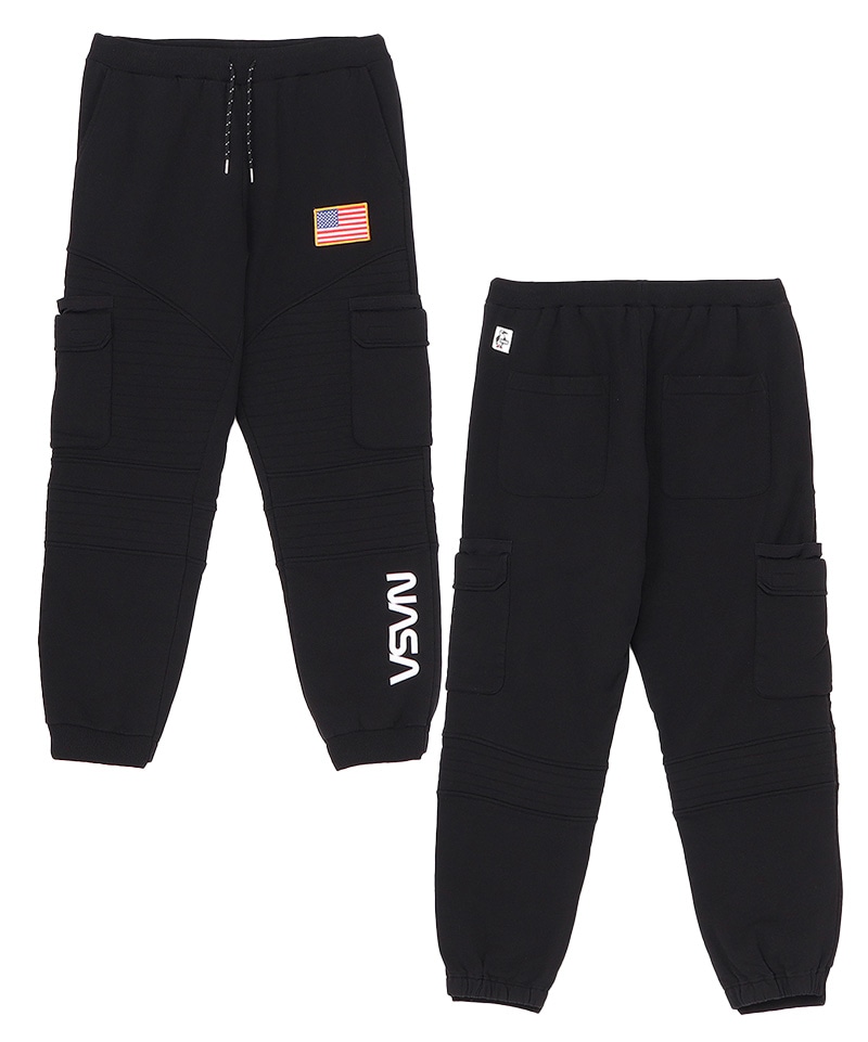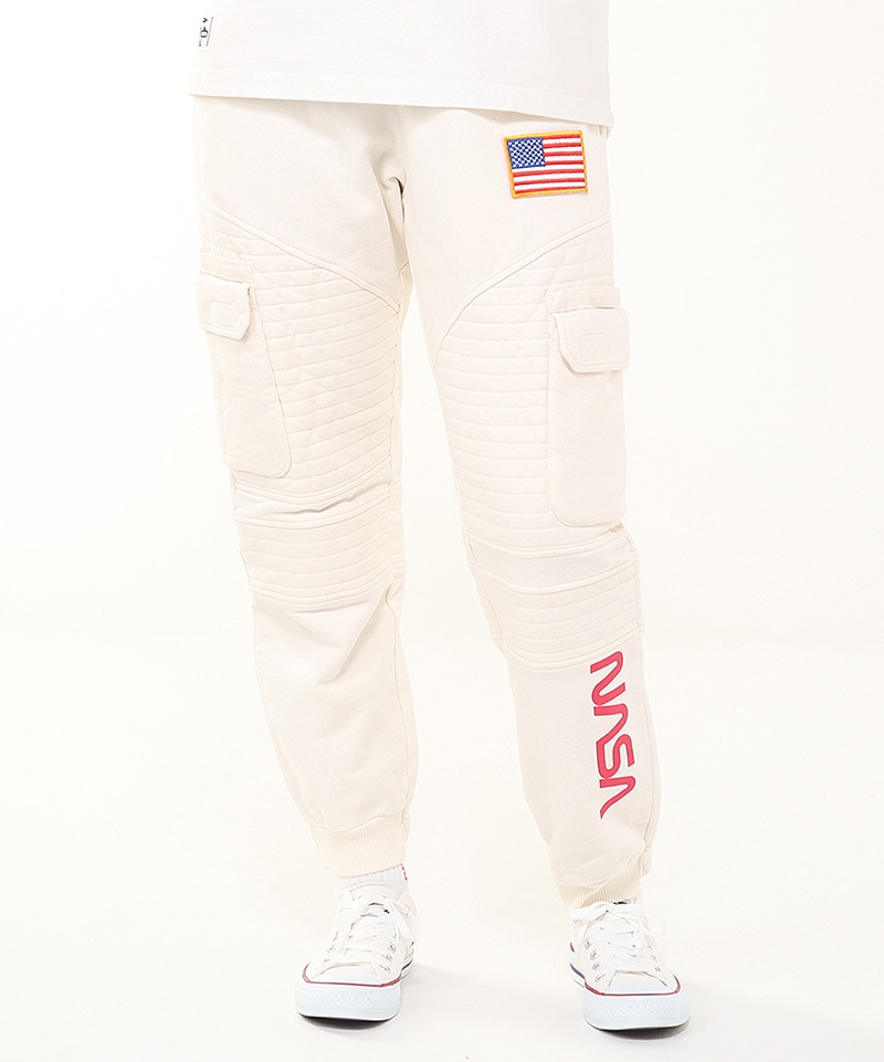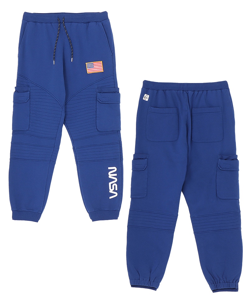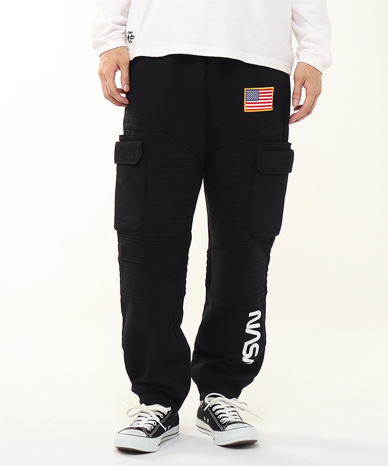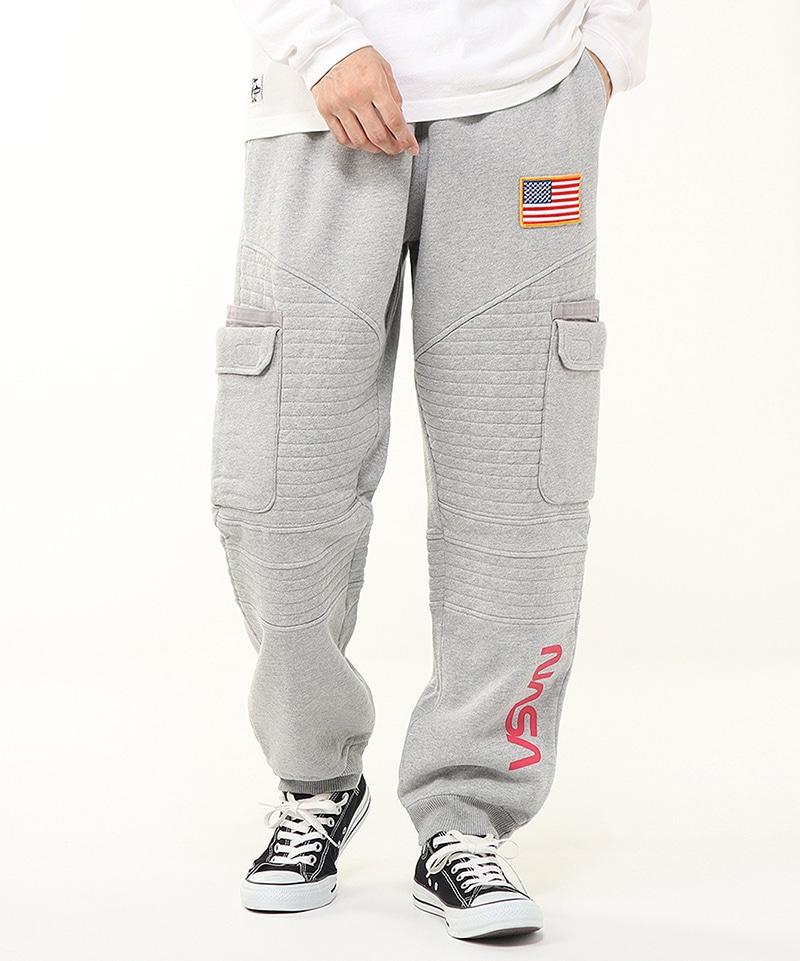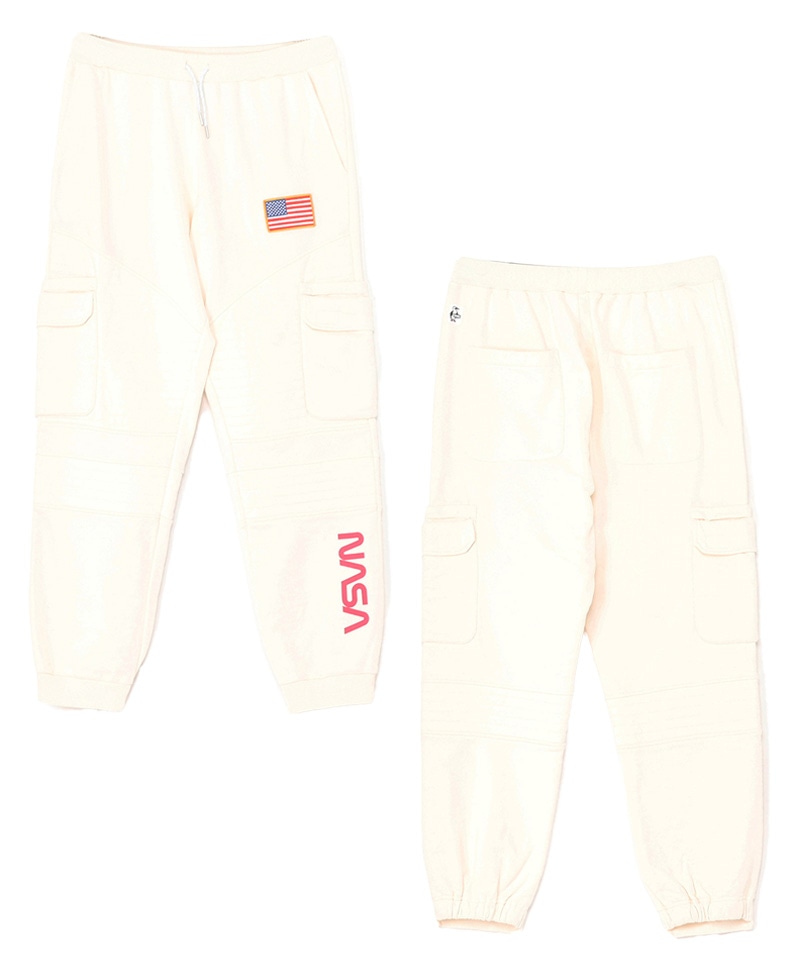 程よいゆとりを持たせたスウェットカーゴパンツ。左足にはNASAのワームロゴとアメリカ国旗のワッペンをあしらい、両サイドには軍用ウェアにも採用される多重構造のポケットをレイアウト。ポケットのベースには布帛生地を使用し、異素材によるメリハリを加えました。