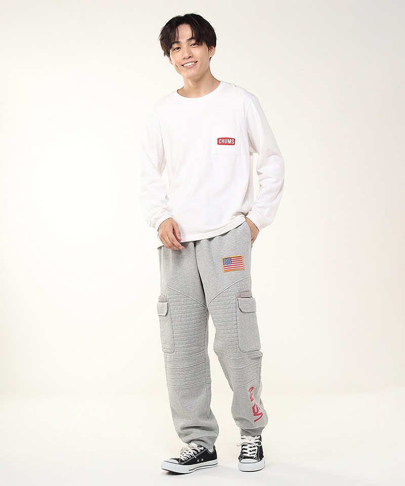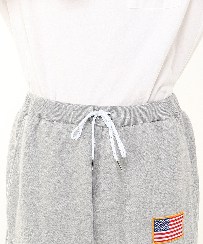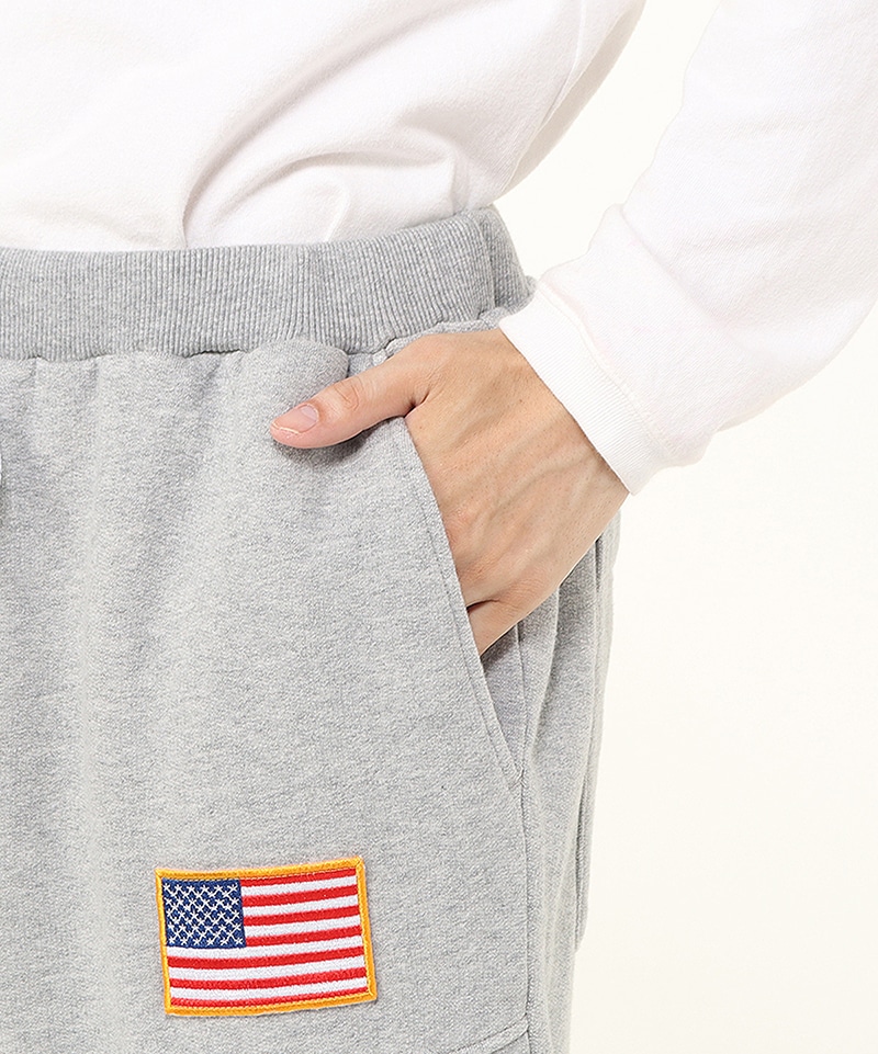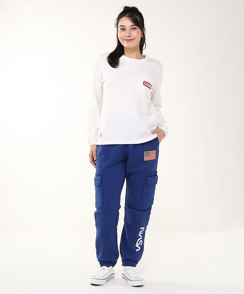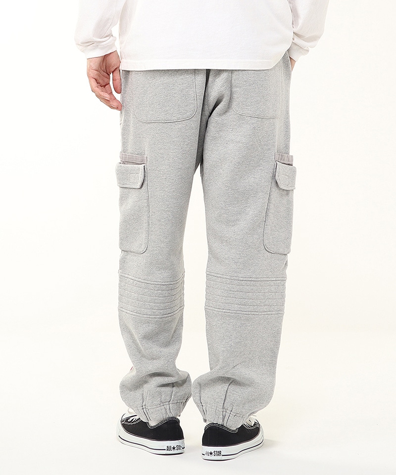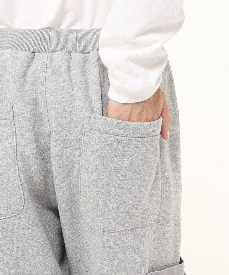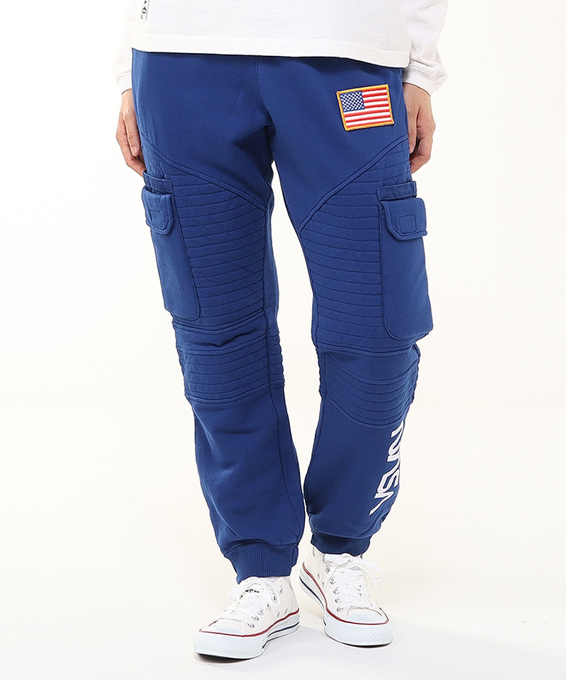 程よいゆとりを持たせたスウェットカーゴパンツ。左足にはNASAのワームロゴとアメリカ国旗のワッペンをあしらい、両サイドには軍用ウェアにも採用される多重構造のポケットをレイアウト。ポケットのベースには布帛生地を使用し、異素材によるメリハリを加えました。