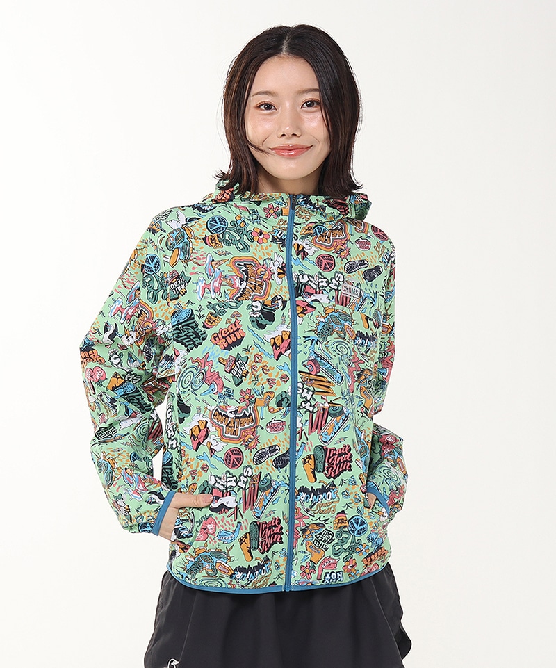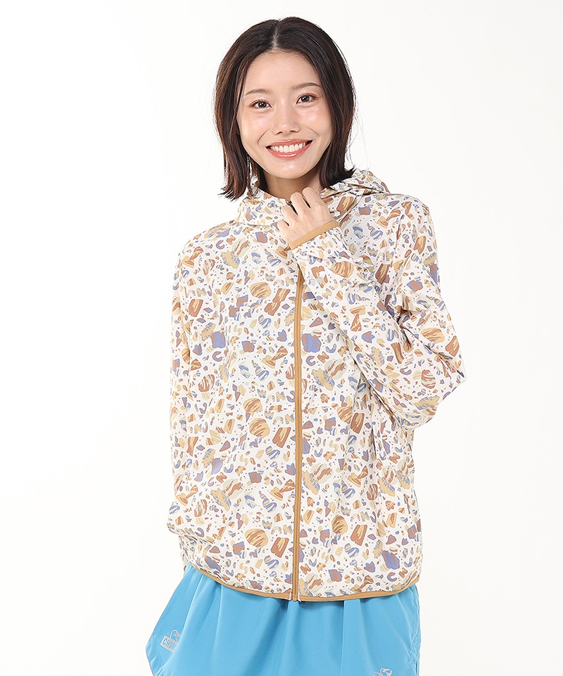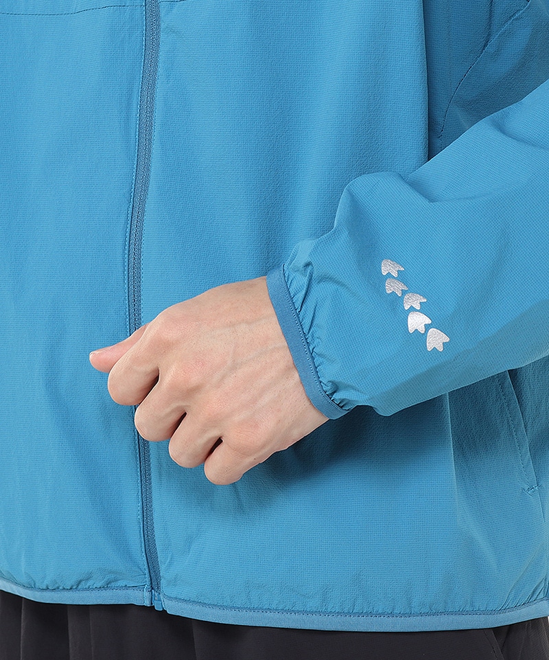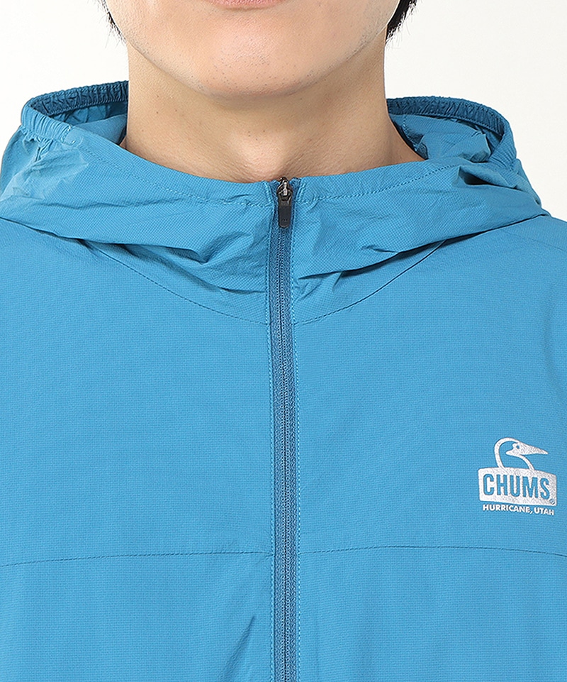 ランニングに最適なフルジップジャケット。フロントにはバッジロゴをモチーフにしたカッティングを入れて、CHUMSらしいあそびゴコロを表現。左胸にはブービーフェイスロゴ、袖先にはブービーフット、背面には「RUNNING WITH YOUR CHUMS!」のリフレクタープリントを施し、夜間の視認性を高めながらデザインのアクセントにしています。