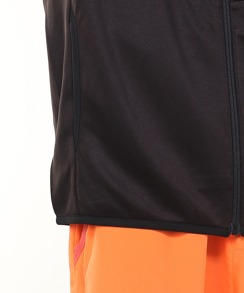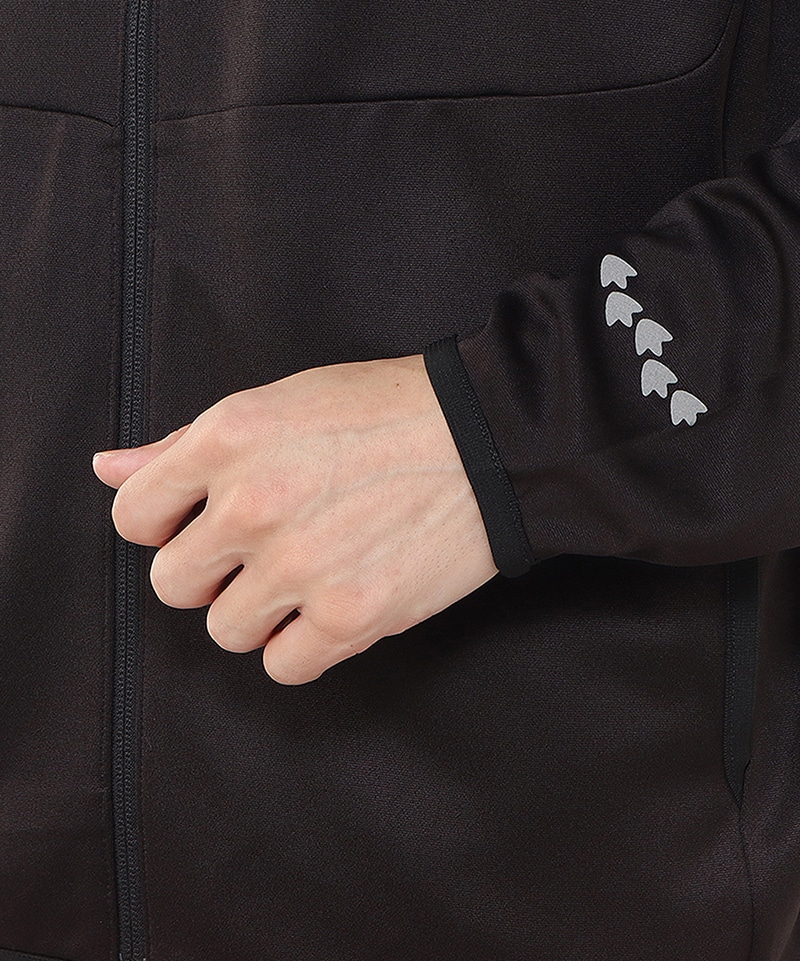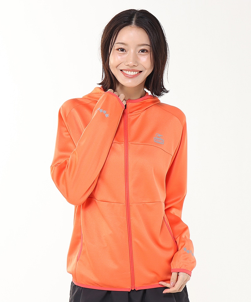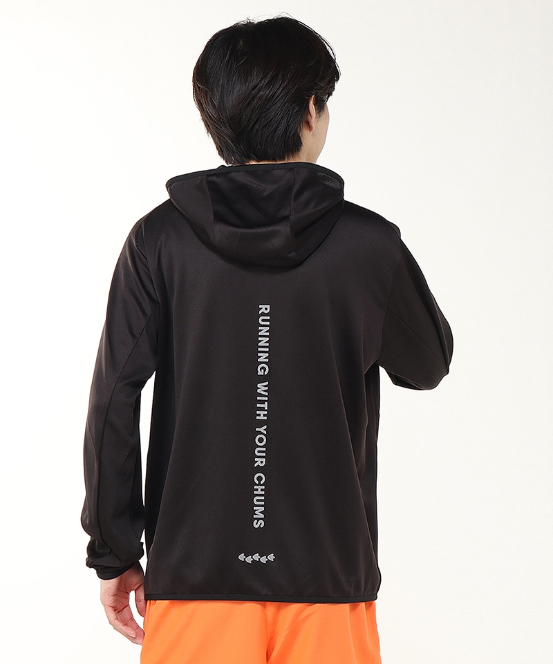 ハイストレッチでなめらかな肌触りが魅力のフルジップパーカー。フロントにはバッジロゴをモチーフにしたカッティングを入れて、CHUMSらしいあそびゴコロを表現。左胸にはブービーフェイスロゴ、袖と背面にはブービーフットと「RUNNING WITH YOUR CHUMS!」のリフレクタープリントを施し、夜間の視認性を高めながらデザインのアクセントにしました。