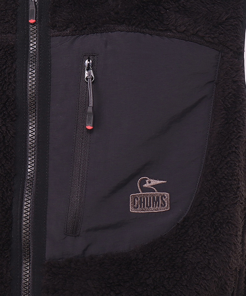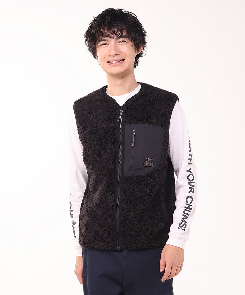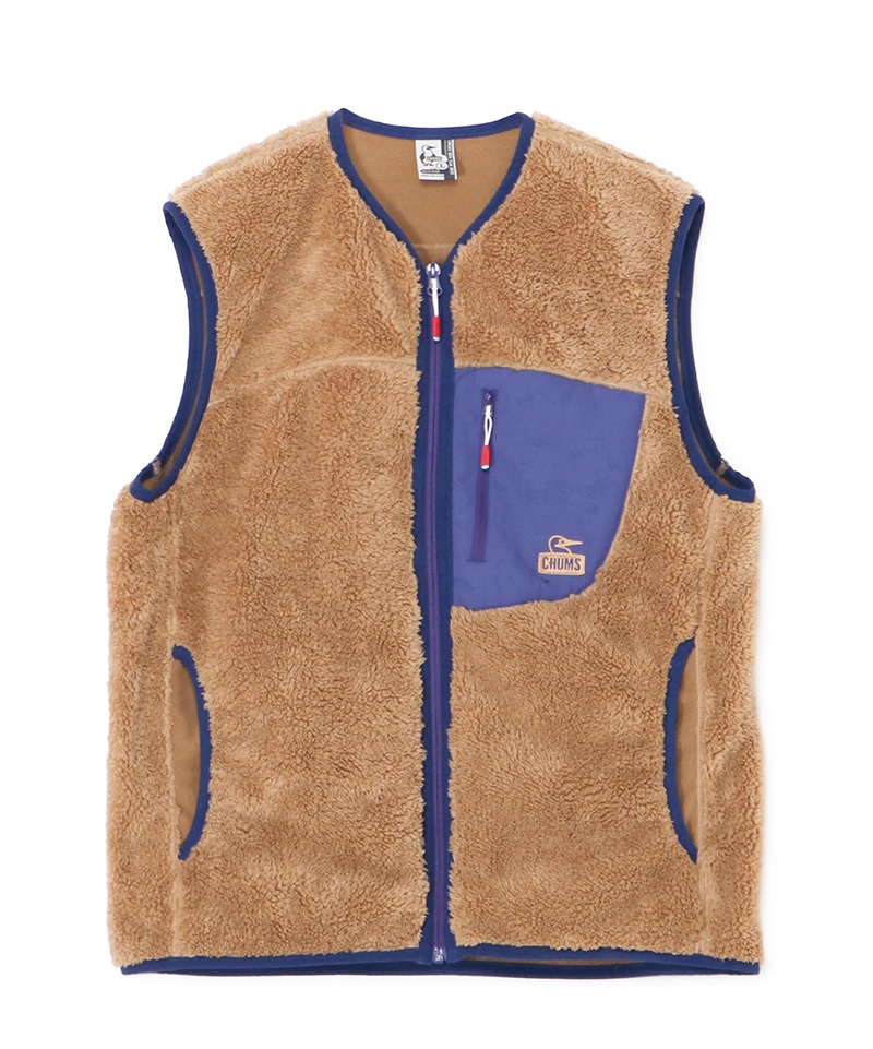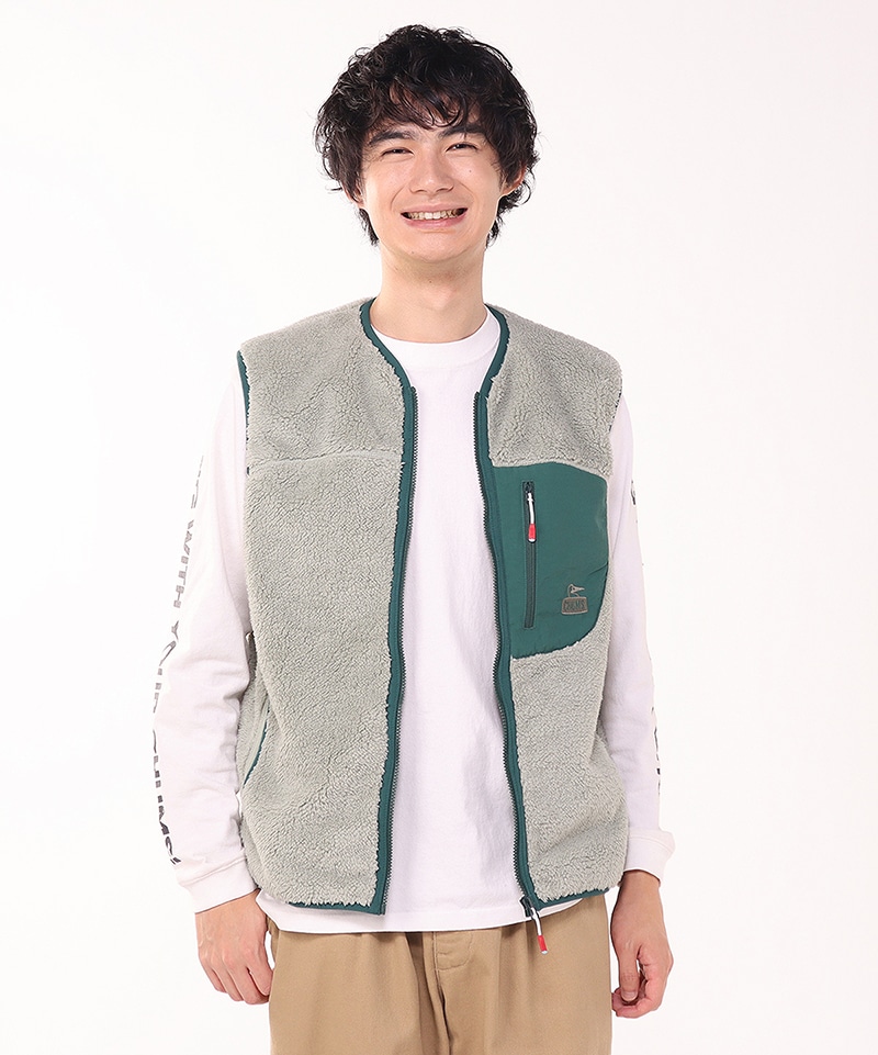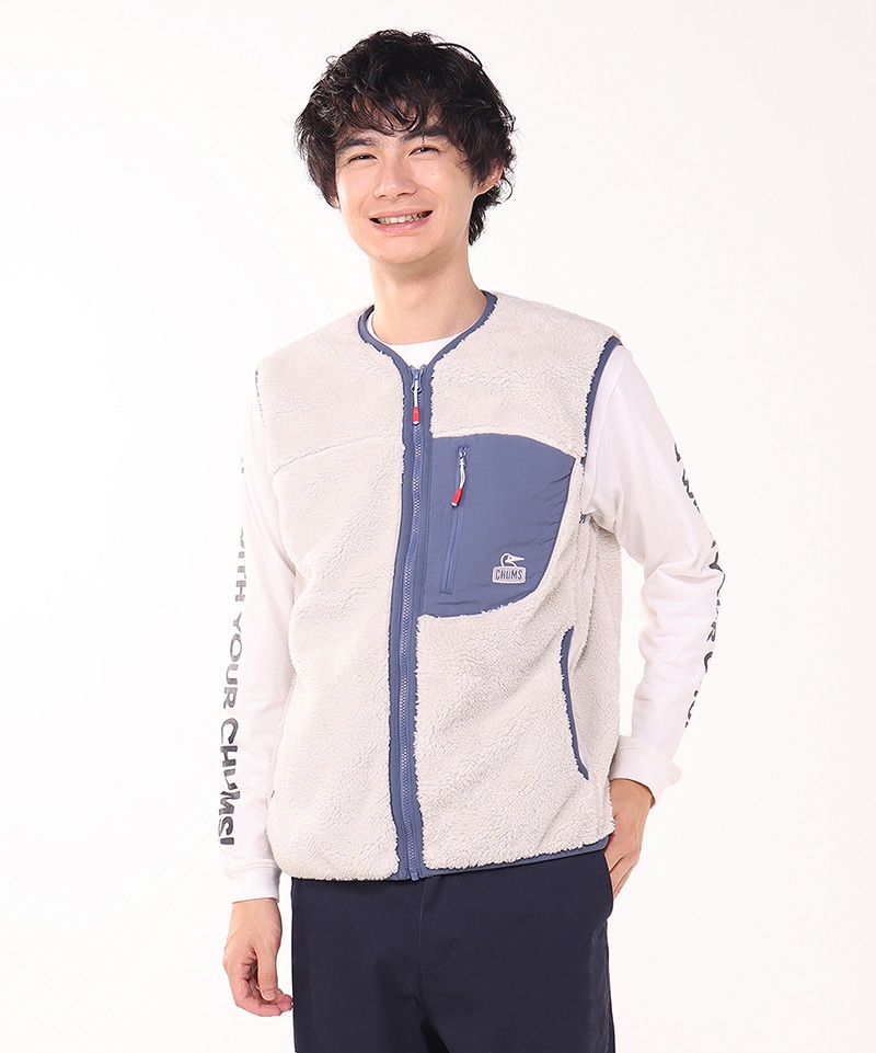 CHUMSの冬の定番、ボンディングフリースを使用したノーカラーベスト。ブービーバードの羽やくちばしをモチーフにした曲線的なカッティングで、CHUMSらしいあそびゴコロを表現しました。