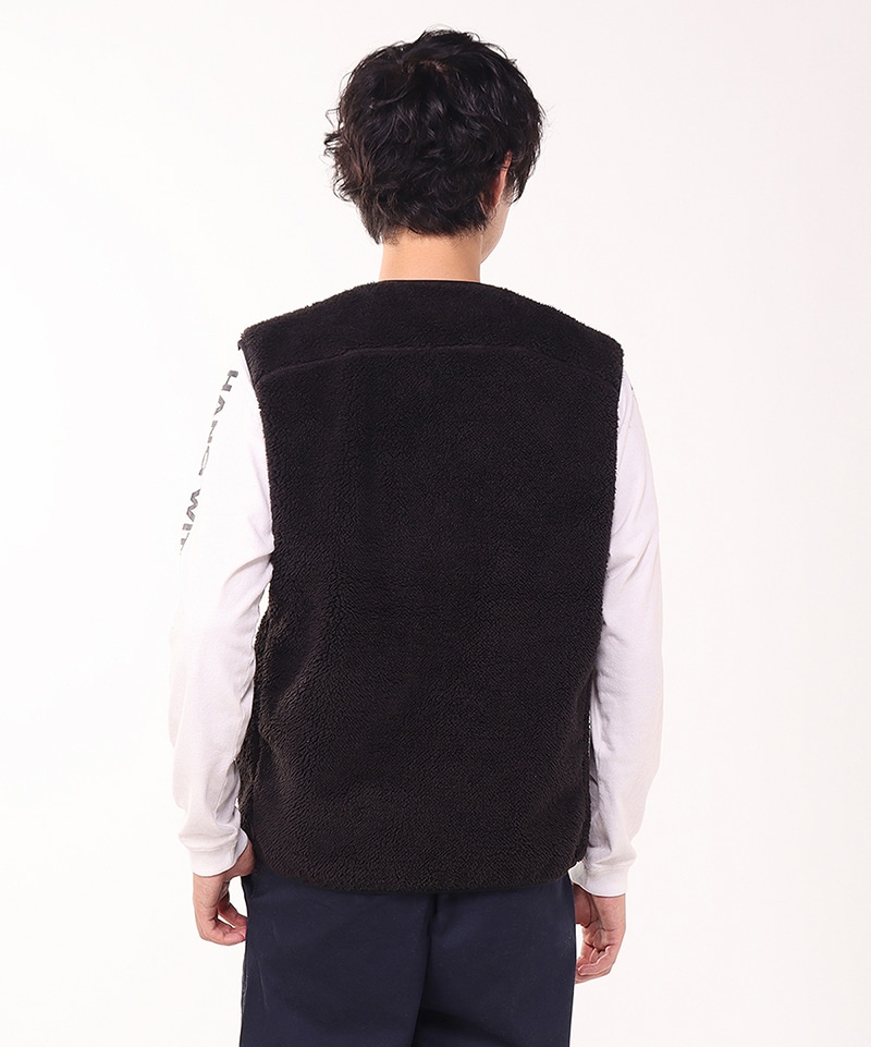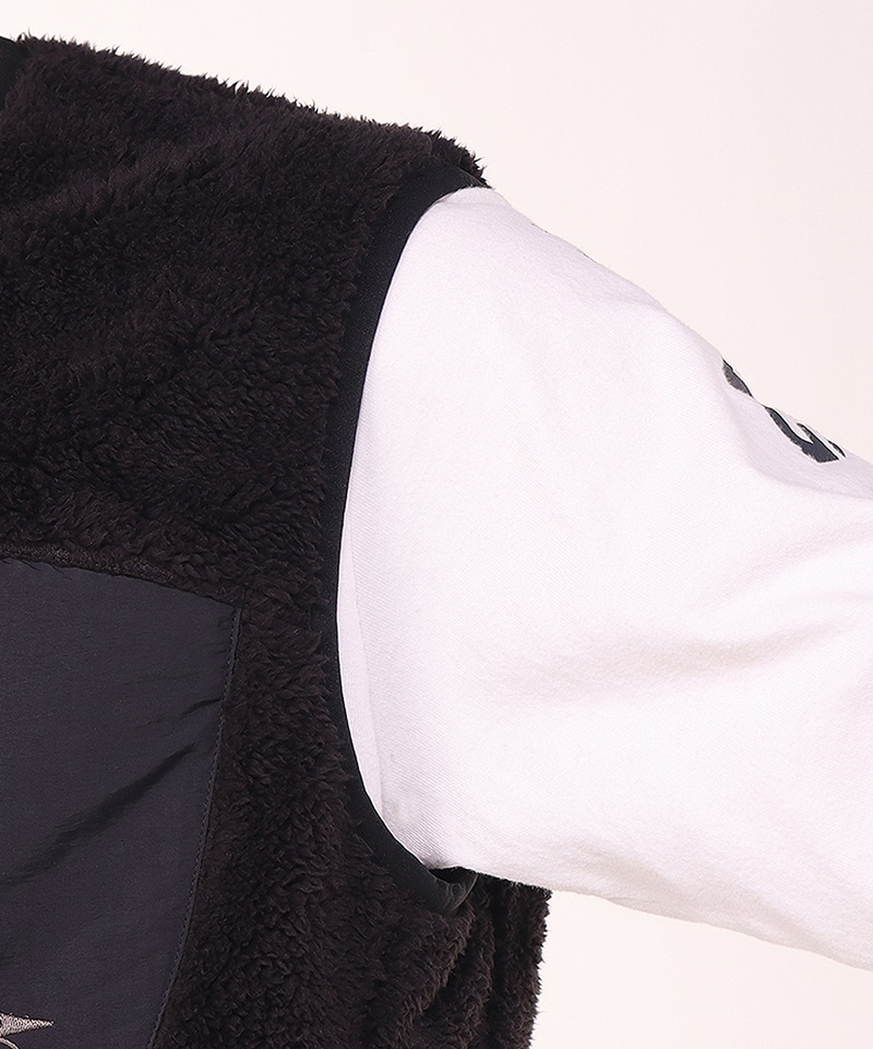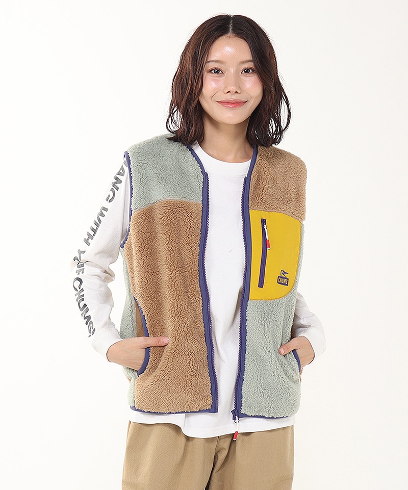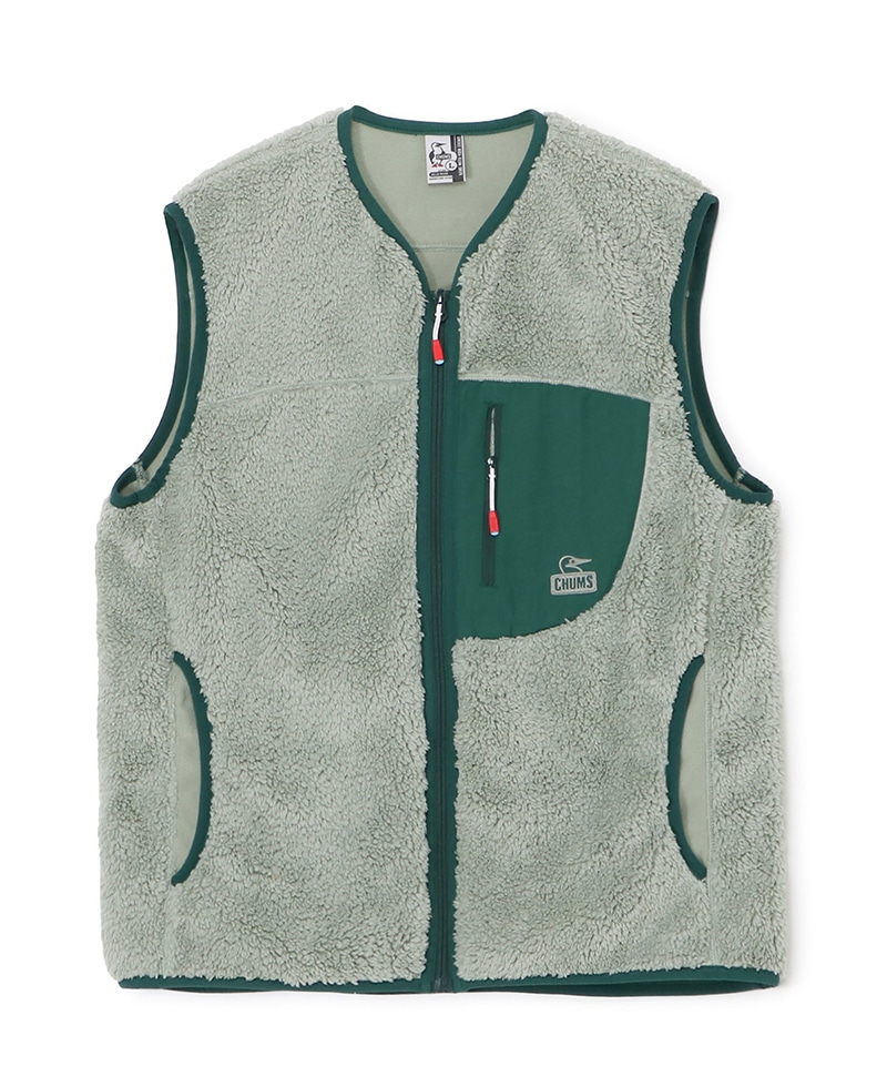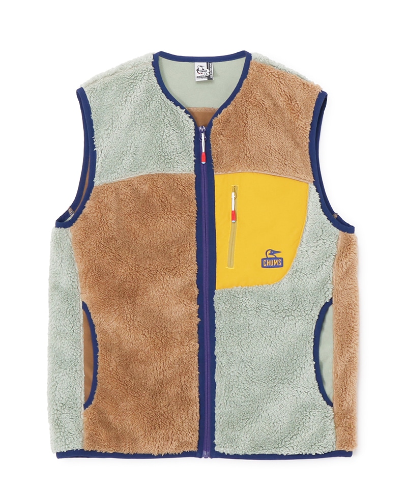 CHUMSの冬の定番、ボンディングフリースを使用したノーカラーベスト。ブービーバードの羽やくちばしをモチーフにした曲線的なカッティングで、CHUMSらしいあそびゴコロを表現しました。