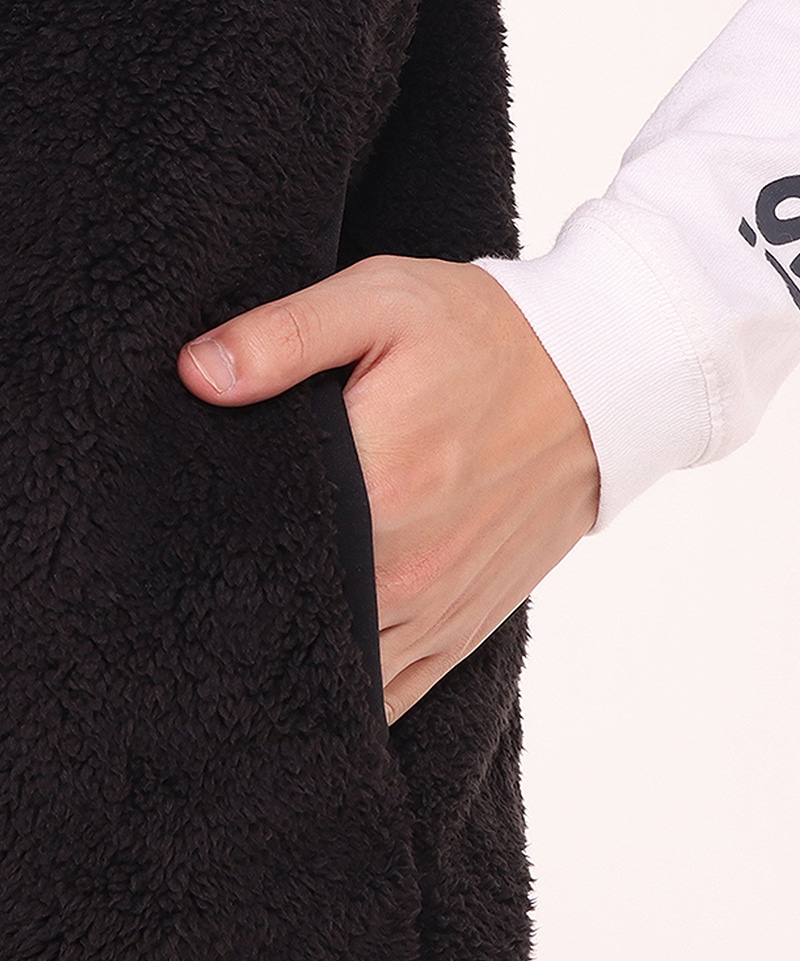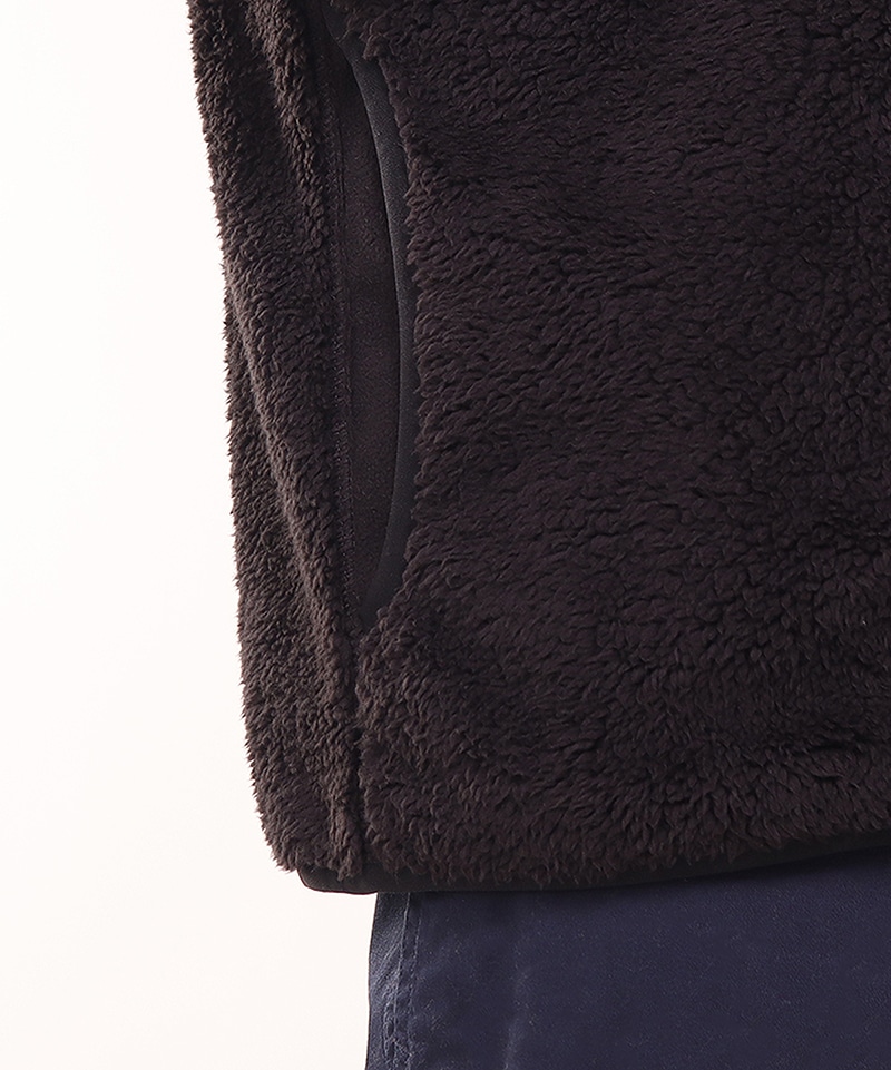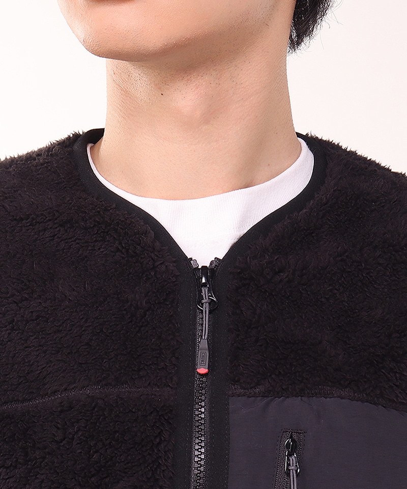 表地には肉厚なボアフリース、裏地にはソフトなマイクロフリースを使用。さらに、その間に防風フィルムを挟み込むことで、冷たい風を遮断しながら圧倒的な保温性を実現しました。