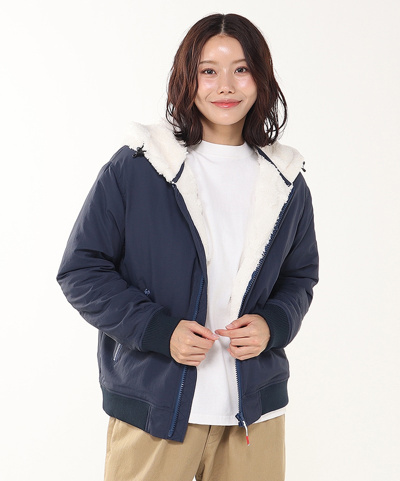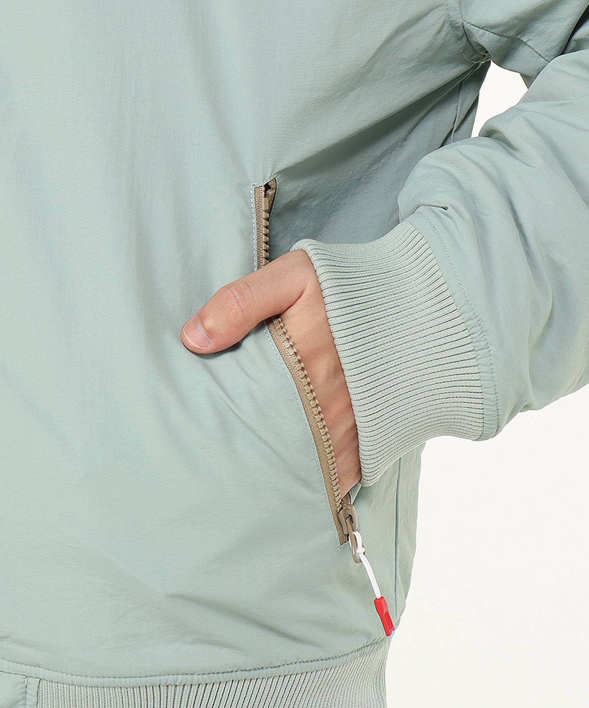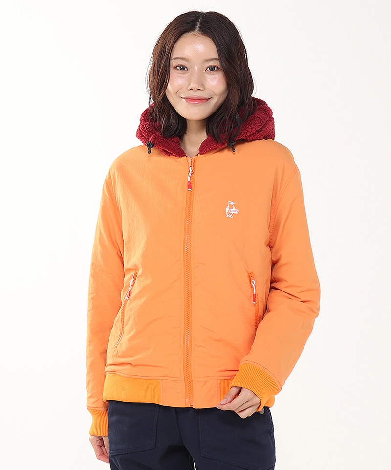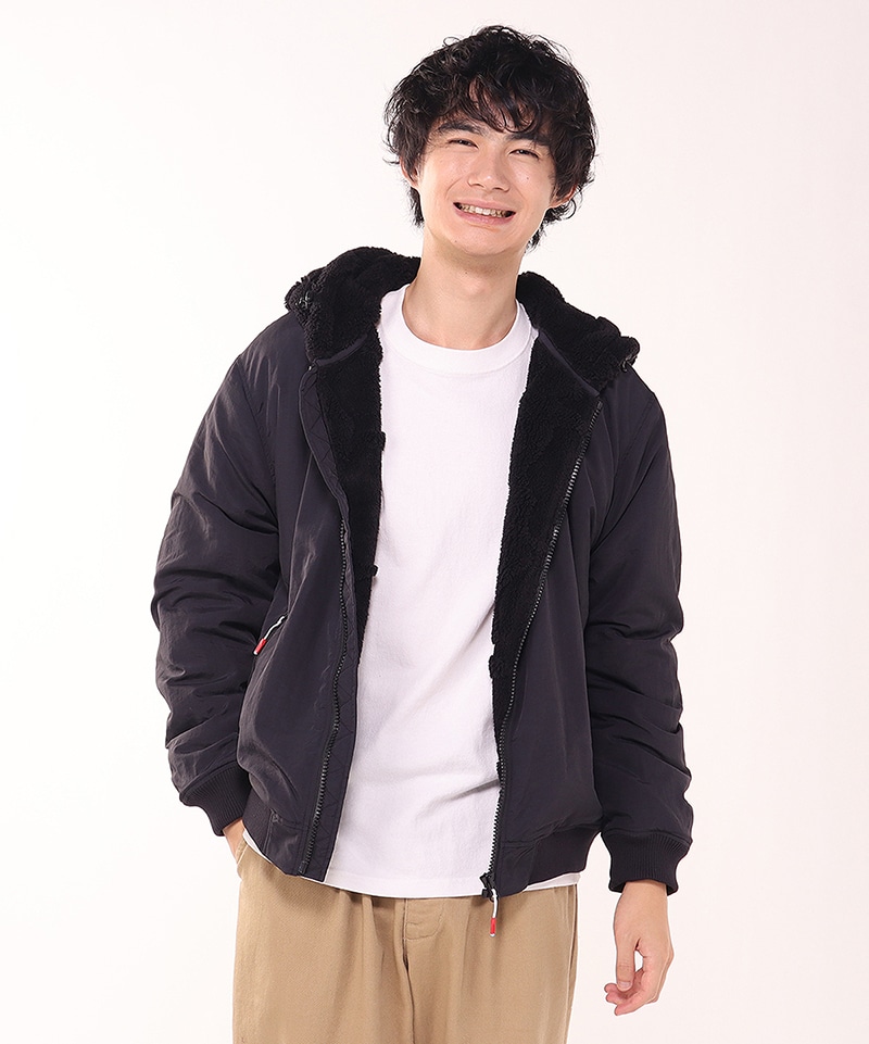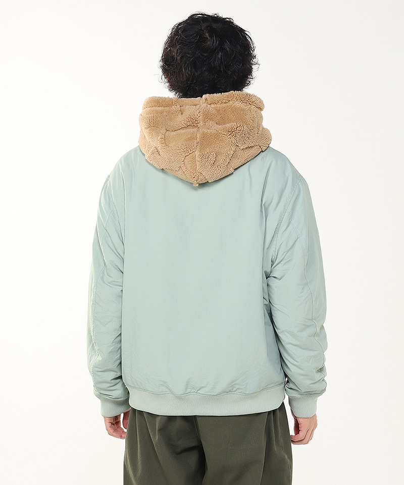 表地にナイロン、内側にエルモフリースを使用したフード付きのフリースブルゾン。フライトジャケットとパーカーを重ね着したようなデザインが特徴的。無骨になりがちなミリタリーテイストにエルモフリースの柔らかさをミックスすることで、CHUMSらしい可愛げのあるアウターに仕上げました。