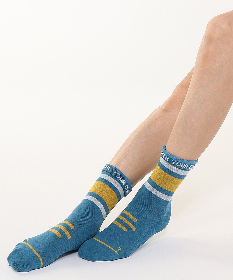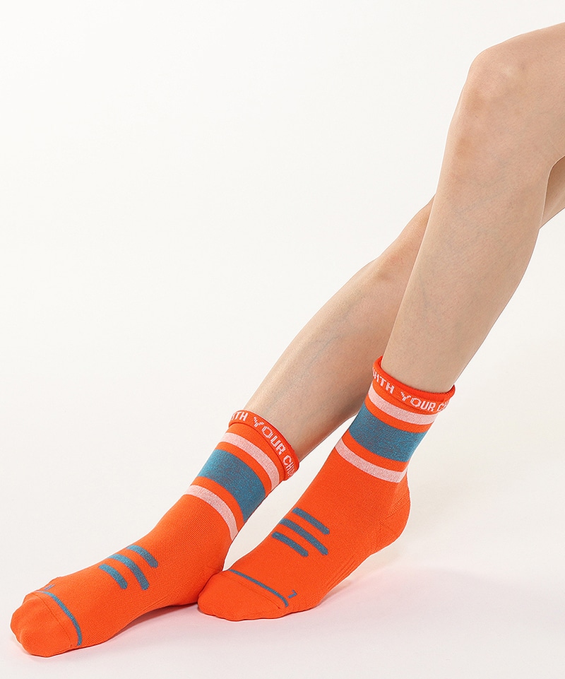 スケーターソックスのようなルックスに、ランニングに最適な機能をプラスしたソックス。履き口には「RUNNING WITH YOUR CHUMS」の文字を編みで表現し、折り返して履くことも可能。背面にはブービーバードの足跡のリフレクタープリントをあしらい、夜間のランニングでも視認性をサポートします。