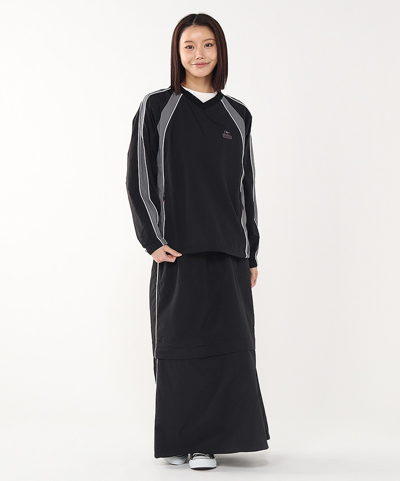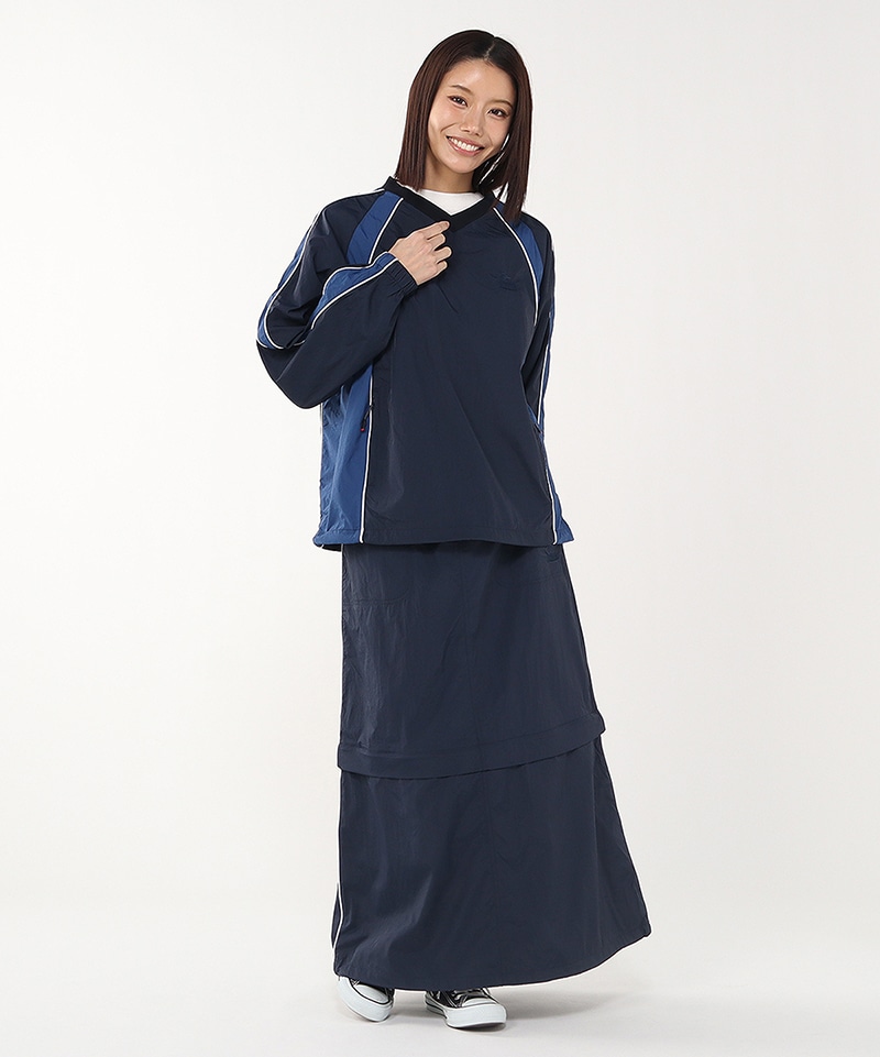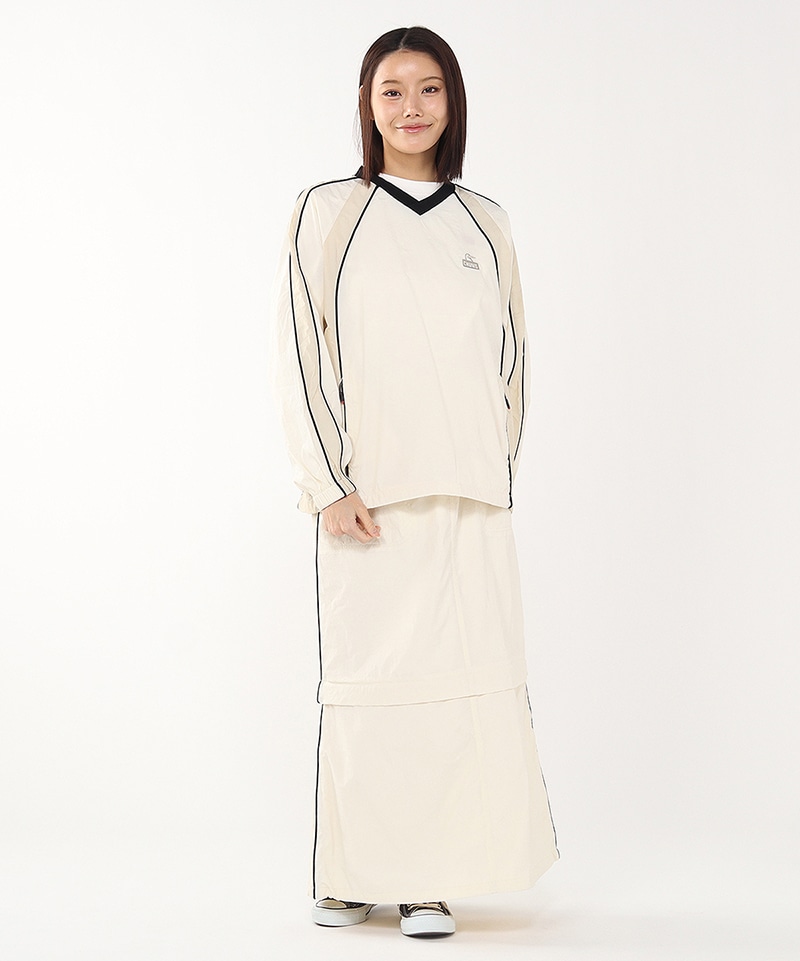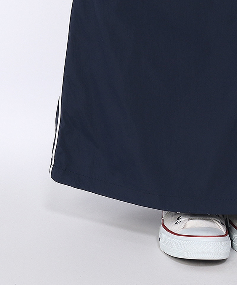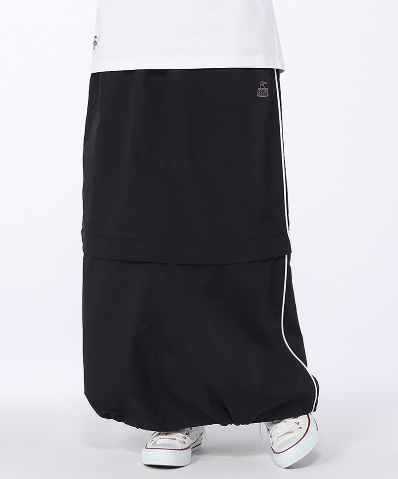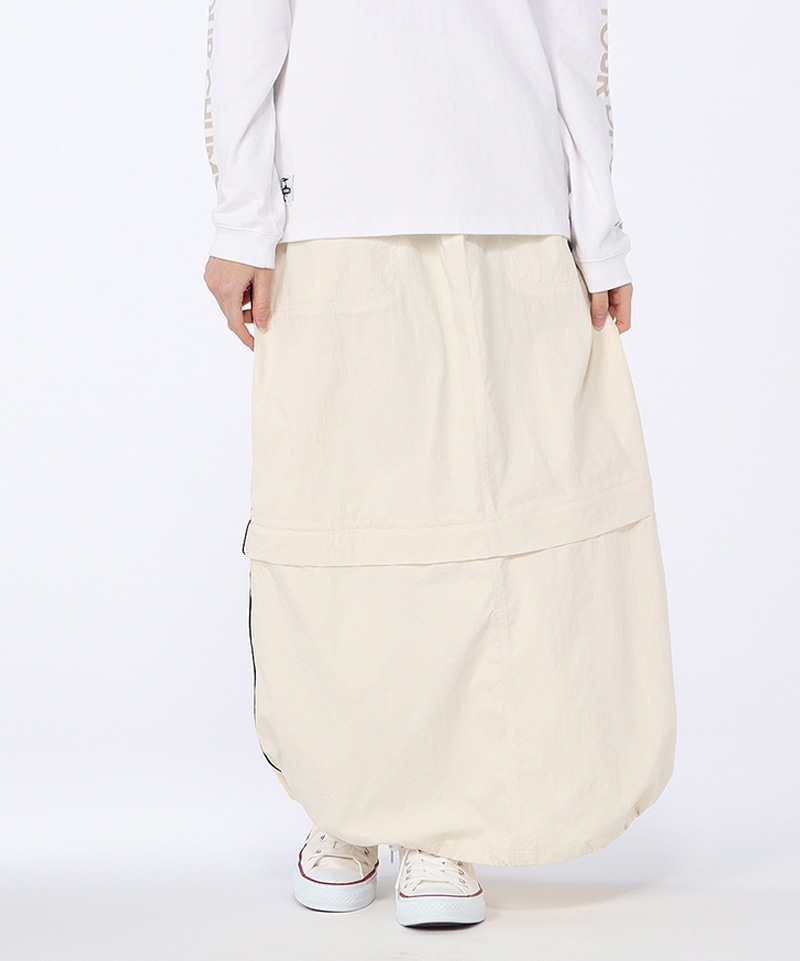 パイピングがアクセントのスポーティなロングスカート。丈が変えられるコンバーチブル仕様で、ミディ丈スカートとしても使用可能。さらに、裾のドローコードでトレンドのバルーンシルエットにもアレンジできます。