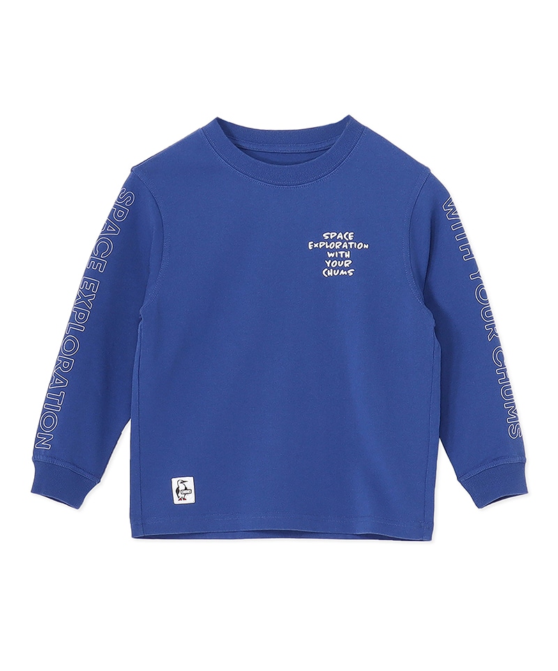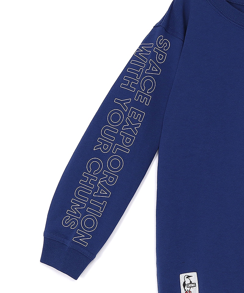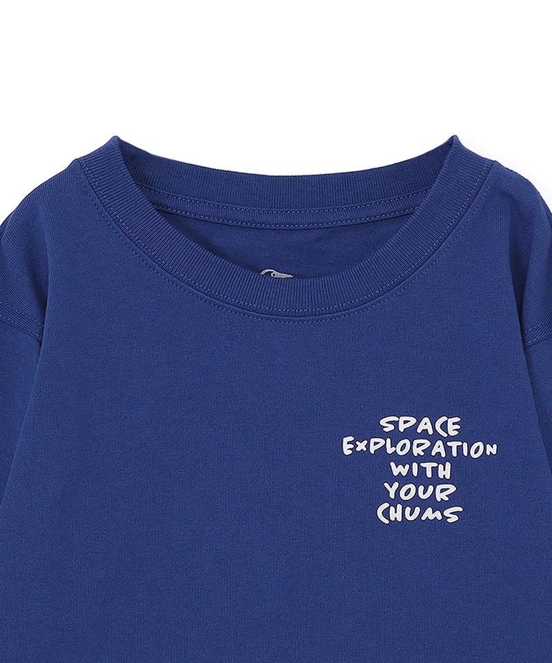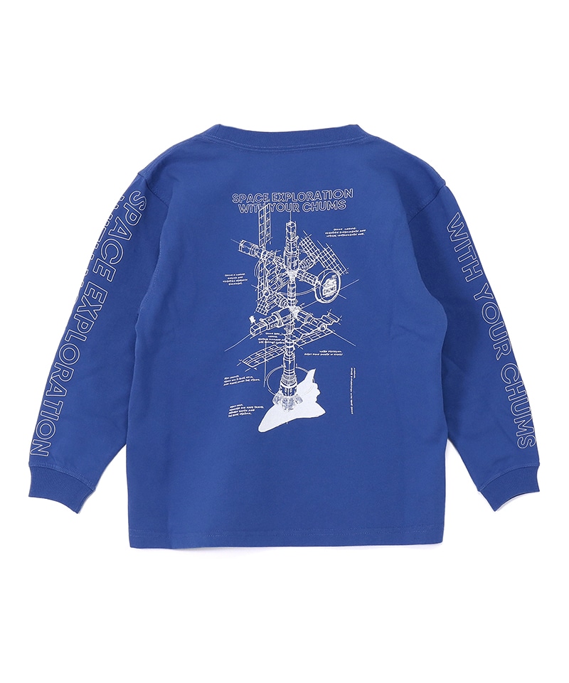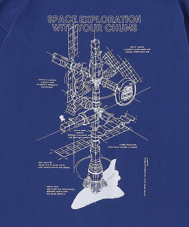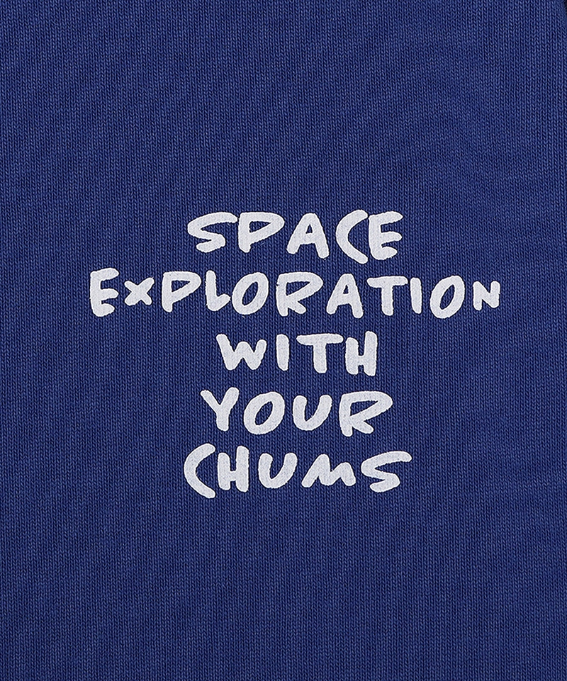 左胸にはミッション名「SPACE EXPLORATION WITH YOUR CHUMS」をあしらい、両袖にも同じメッセージをプリント。背面には、ロシアの宇宙ステーション「ミール」をモチーフにした、構造図風のグラフィックを大胆に配置。細かなラベリングまで描き込まれたあそびゴコロあふれるデザインで、CHUMSらしいユーモアと宇宙へのロマンを感じさせる一枚に仕上げています。