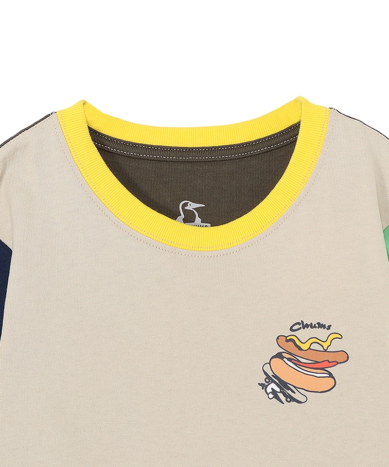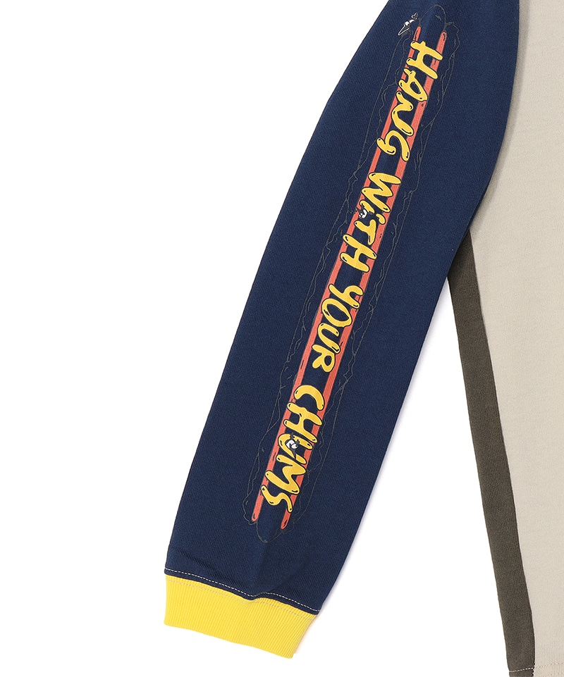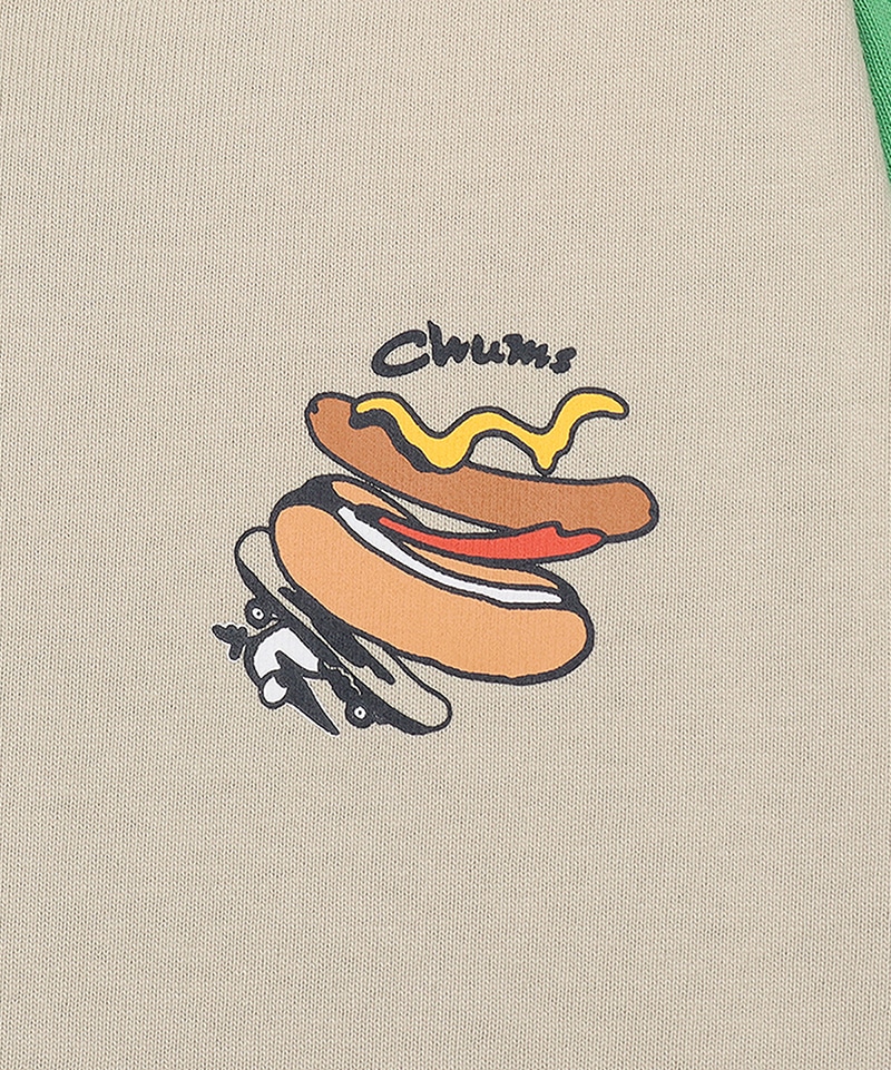 今季のグラフィックの“フード柄”からホットドッグをフィーチャーしたロングスリーブTシャツ。フロントにはスケボーに乗るブービーバードとホットドッグをプリントし、バックにはマスタードで描いた「HANG WITH YOUR CHUMS」のタイポグラフィがインパクトを放ちます。さらに袖にはロングホットドッグを大胆にプリントし、見た目も気分も“ホット”にしてくれるあそびゴコロあふれる一枚です。